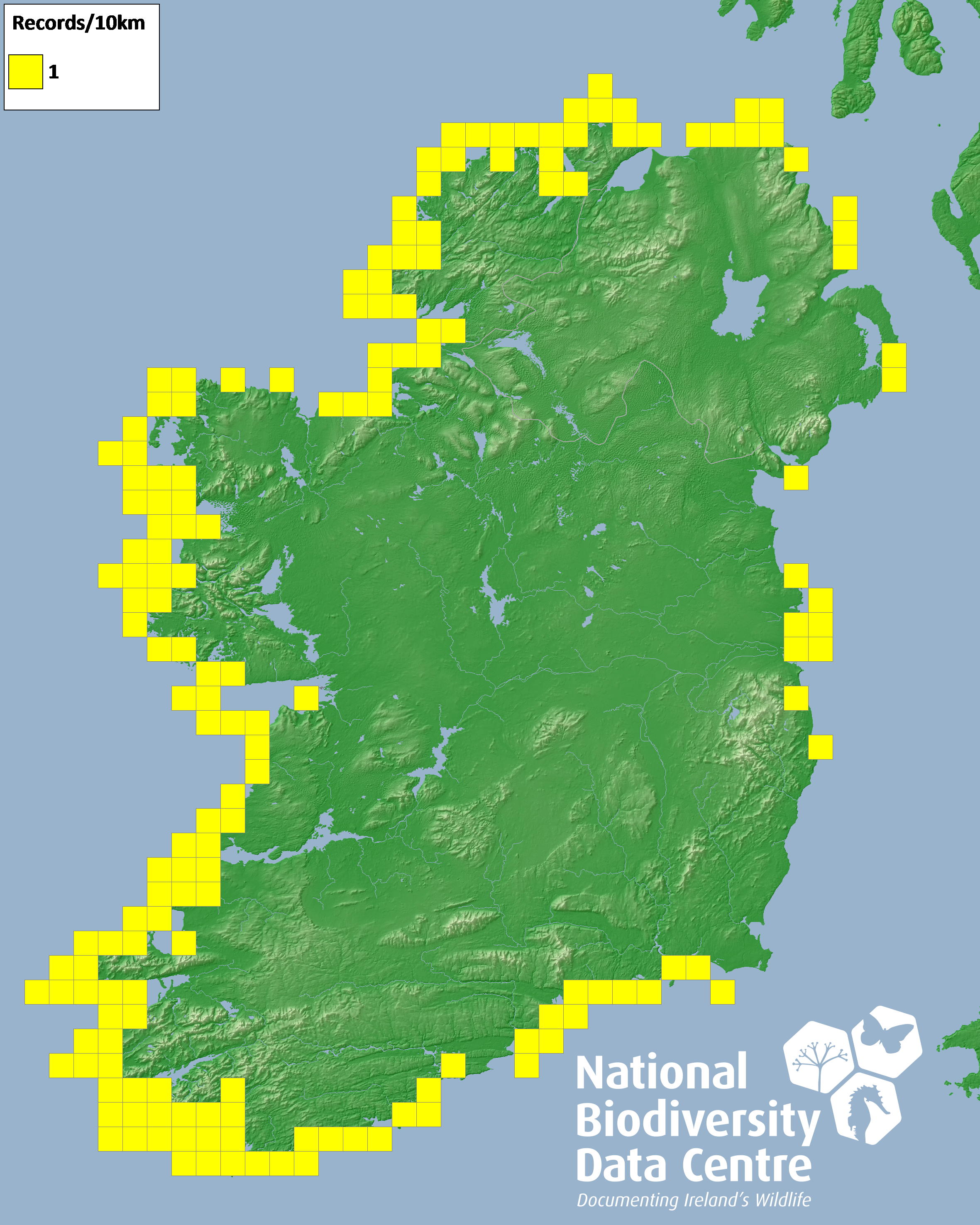 Distribution of the number of records recorded within each 10km grid square (ITM).Marine Map - 50km