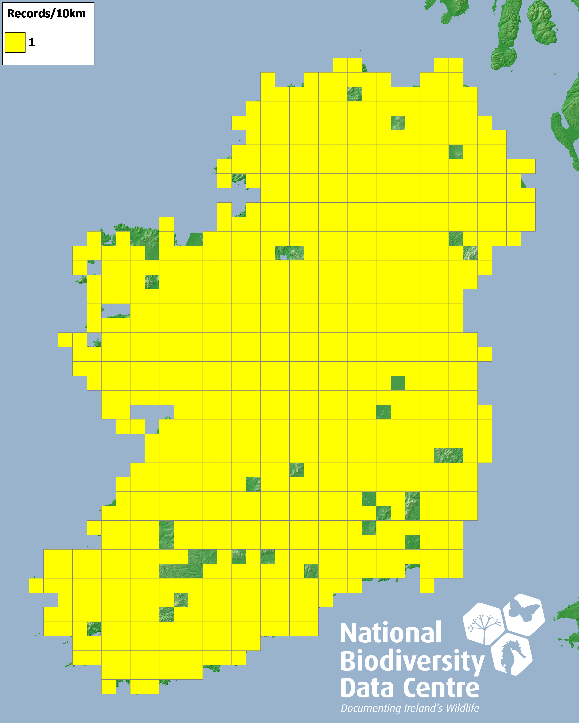 Distribution of the number of records recorded within each 10km grid square (ITM).Marine Map - 50km