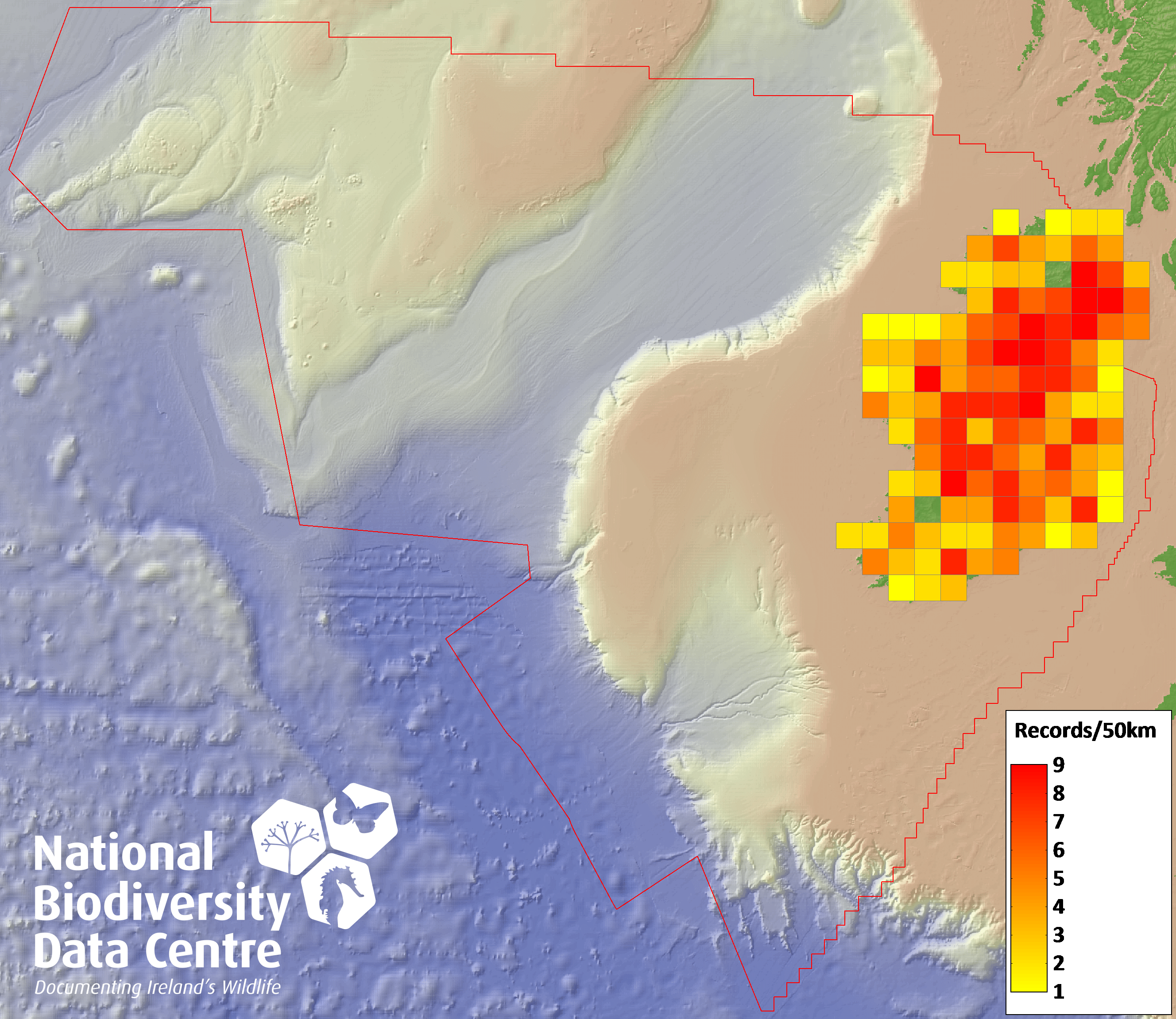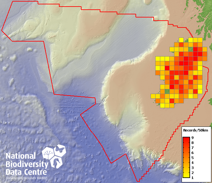 Distribution of the number of records recorded within each 10km grid square (ITM).Marine Map - 50km