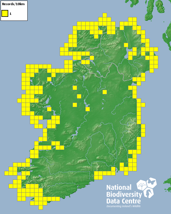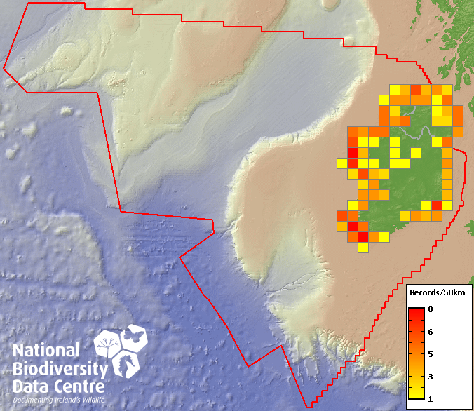 Distribution of the number of records recorded within each 10km grid square (ITM).Marine Map - 50km
