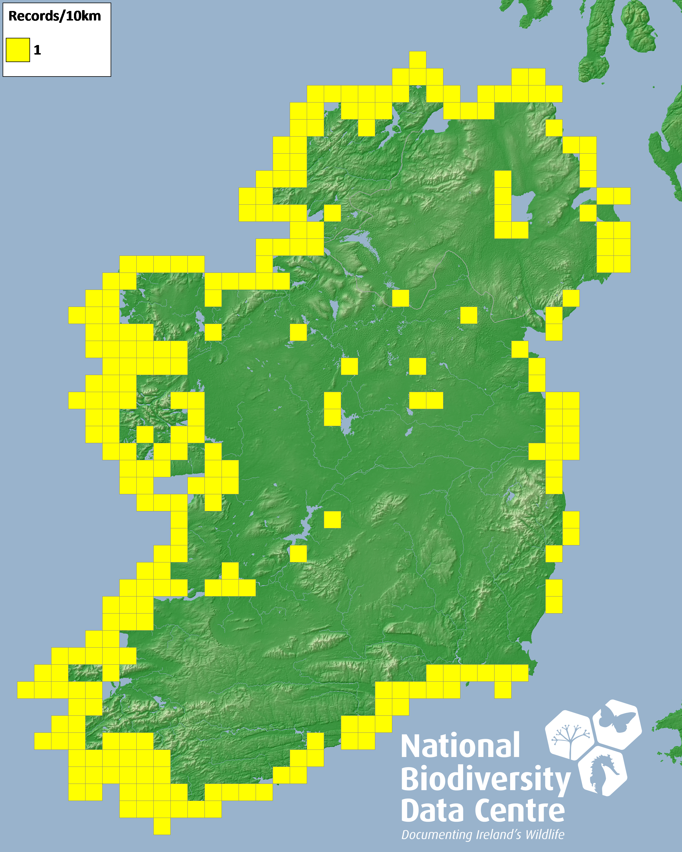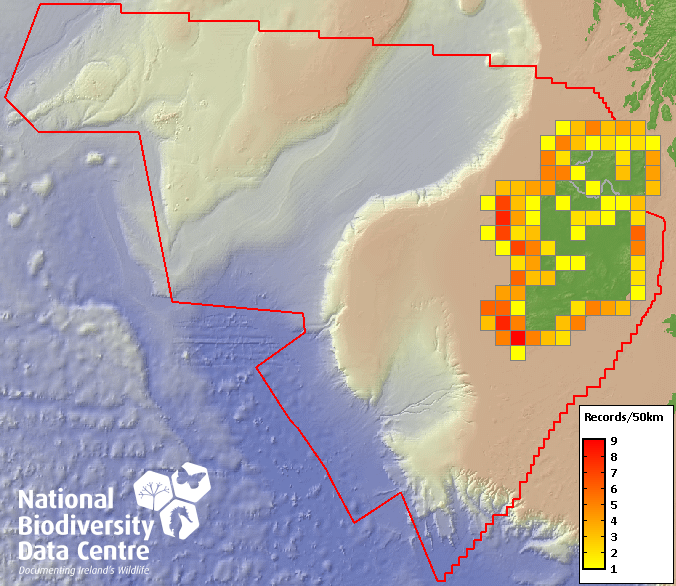 Distribution of the number of records recorded within each 10km grid square (ITM).Marine Map - 50km