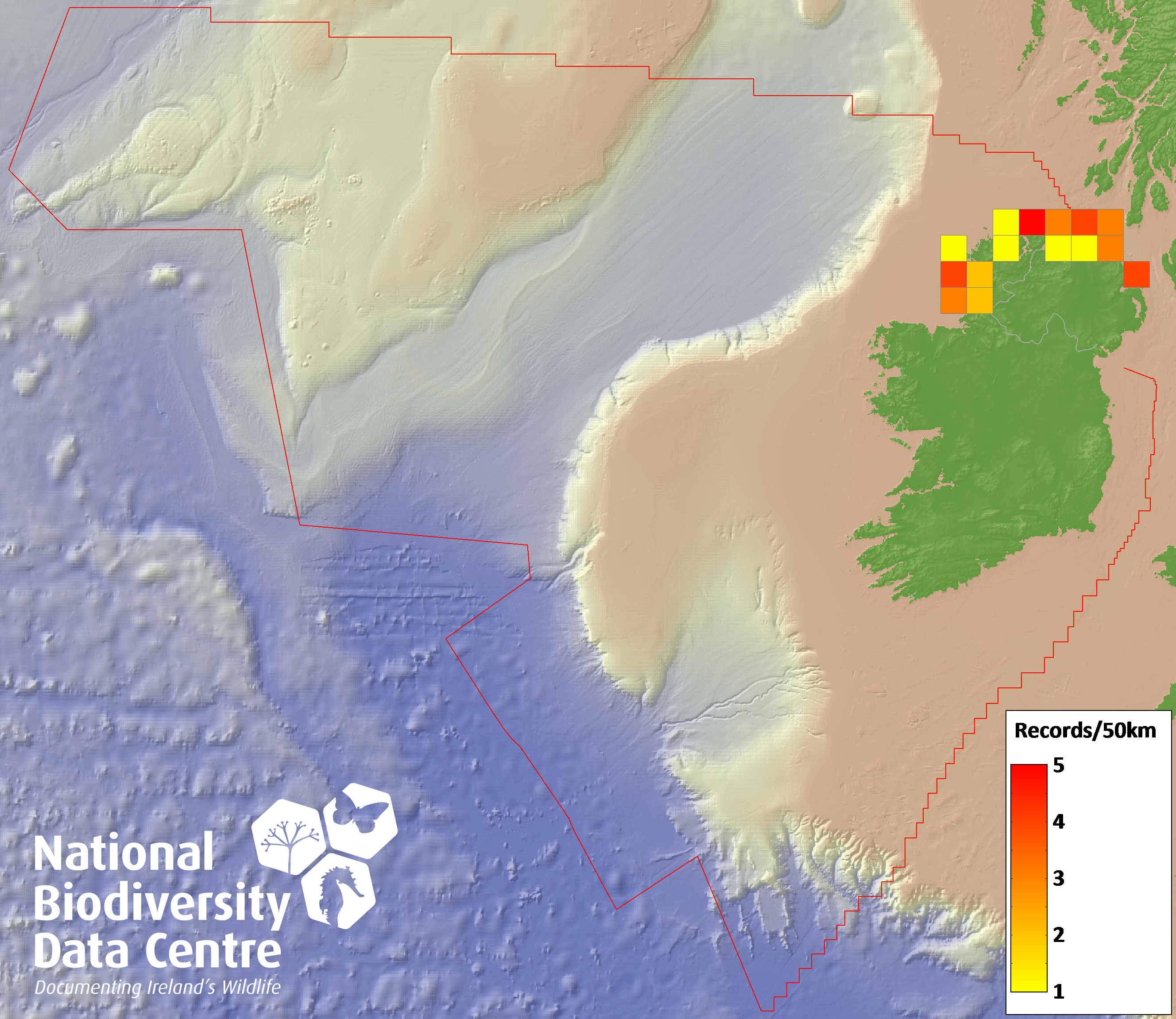 Distribution of the number of records recorded within each 10km grid square (ITM).Marine Map - 50km