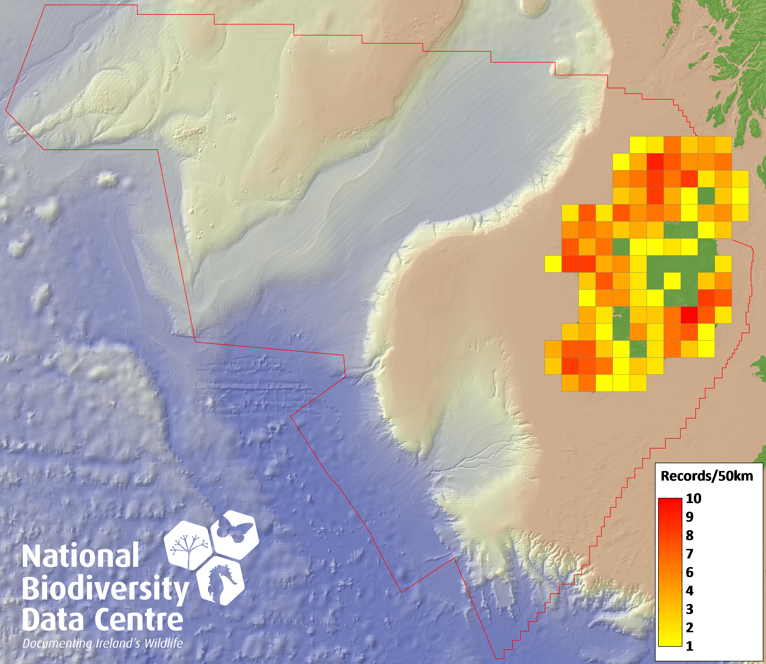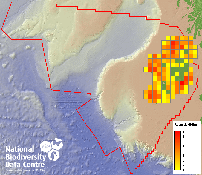 Distribution of the number of records recorded within each 10km grid square (ITM).Marine Map - 50km
