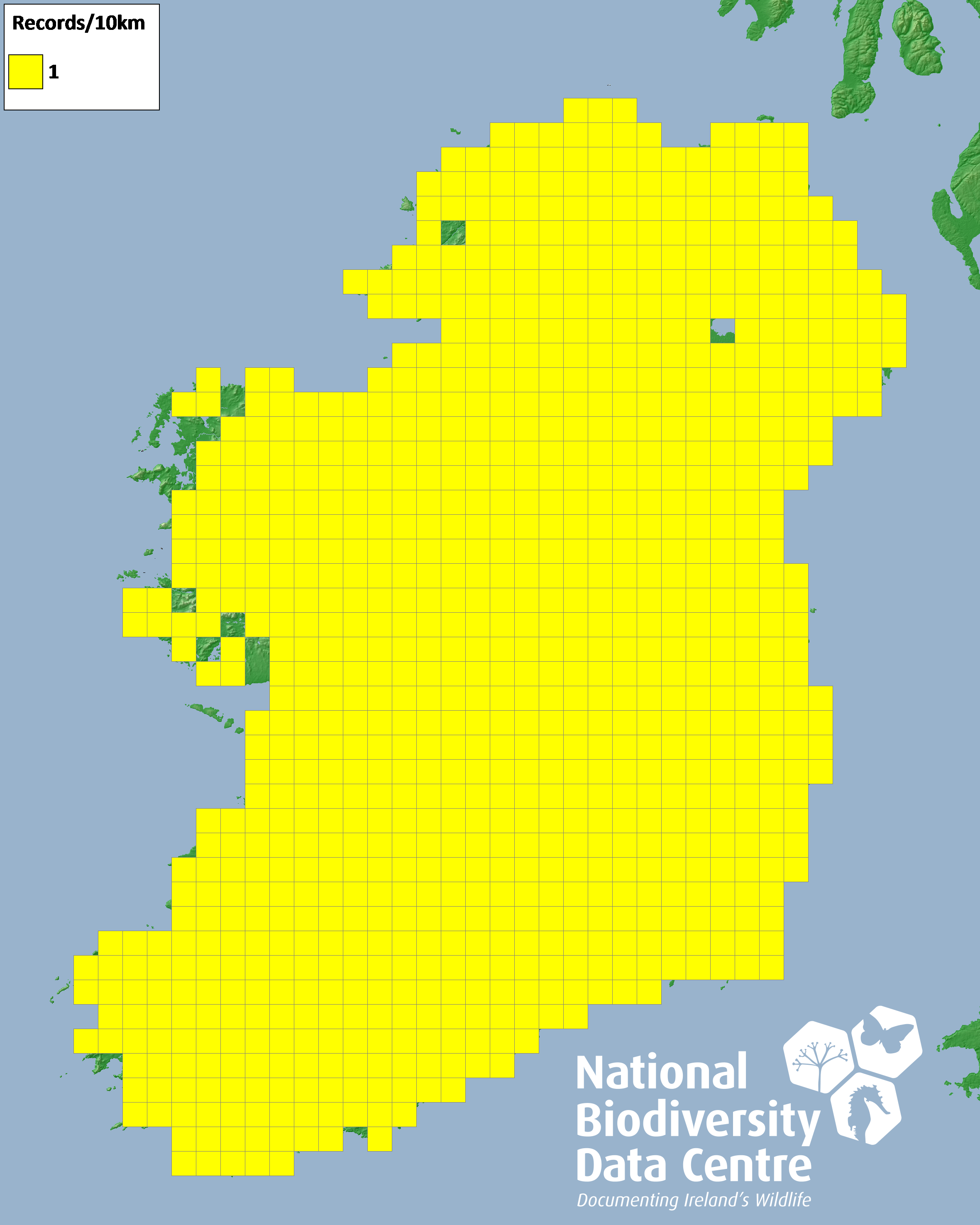 Distribution of the number of records recorded within each 10km grid square (ITM).Marine Map - 50km