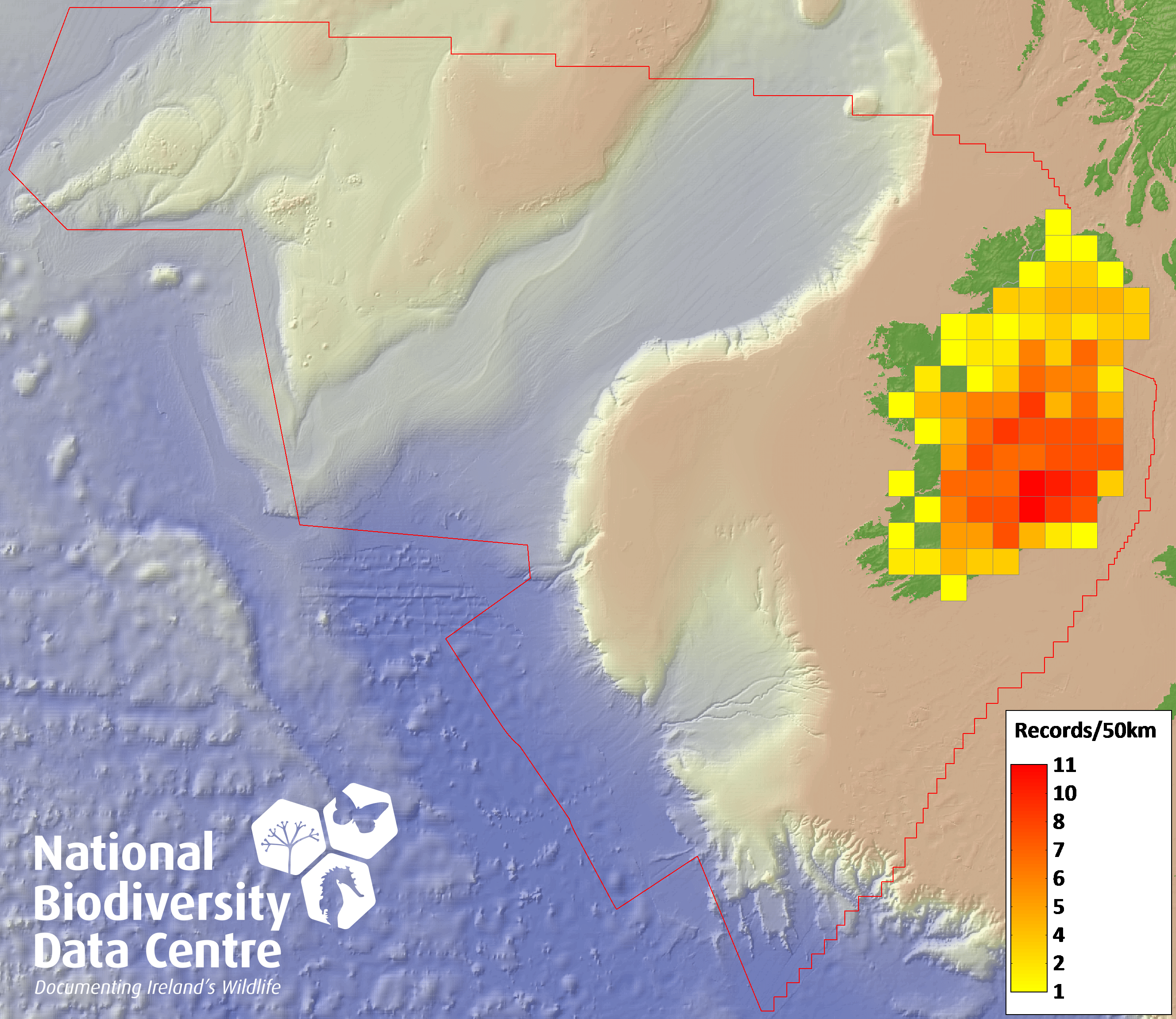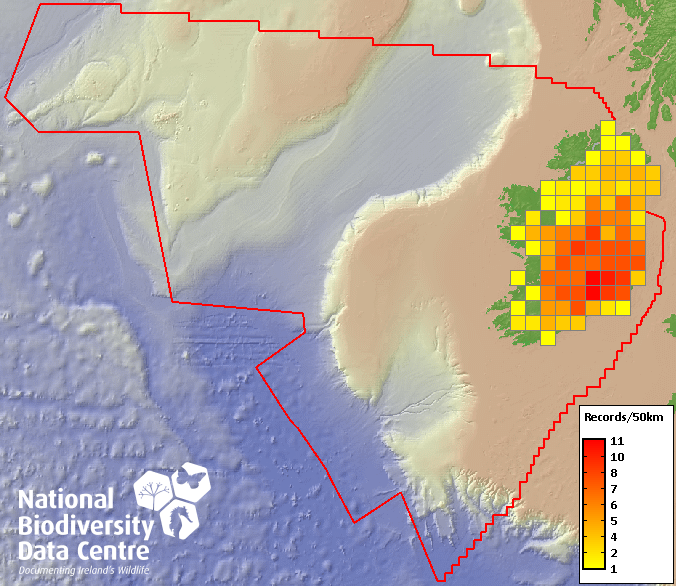 Distribution of the number of records recorded within each 10km grid square (ITM).Marine Map - 50km