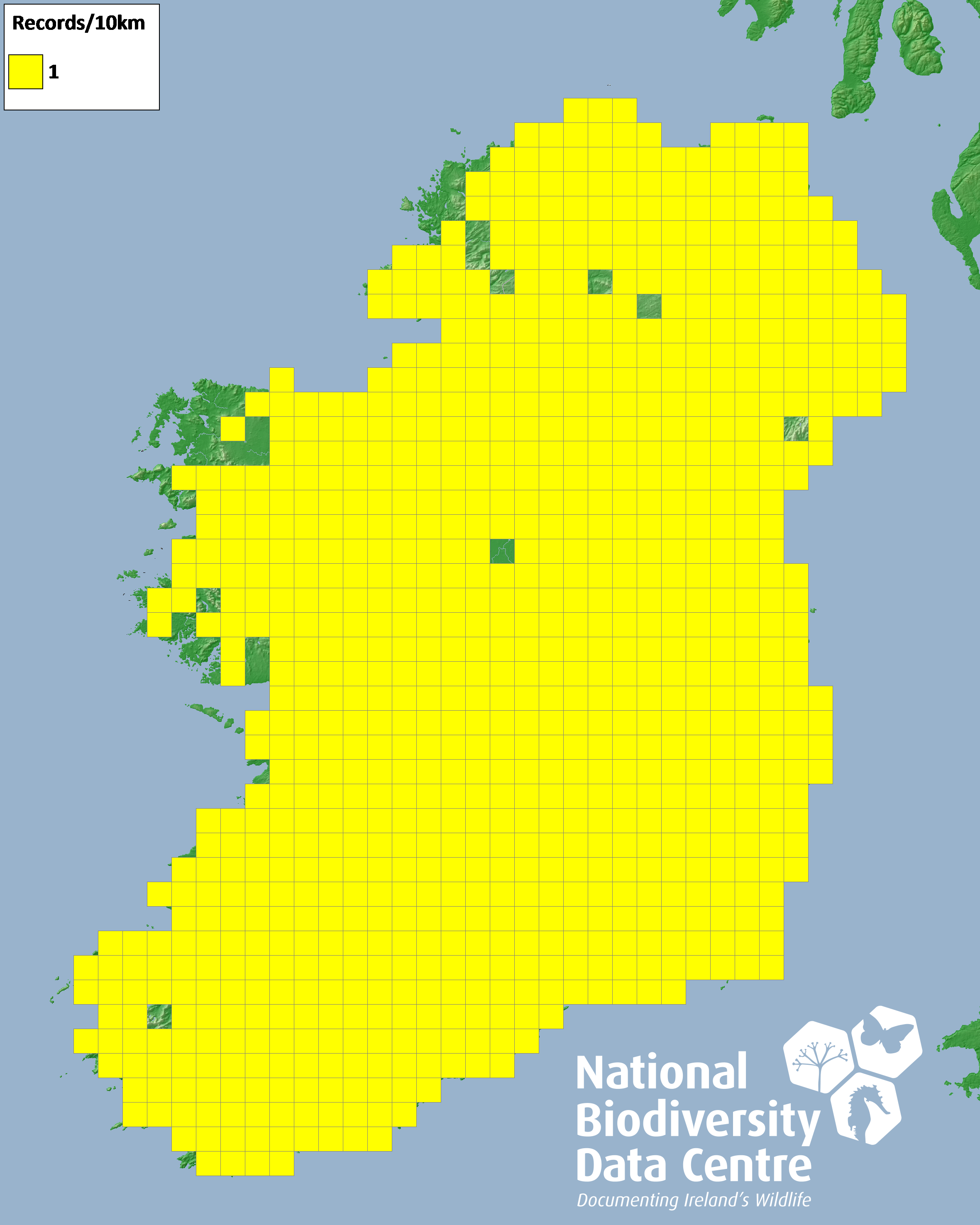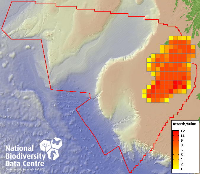 Distribution of the number of records recorded within each 10km grid square (ITM).Marine Map - 50km