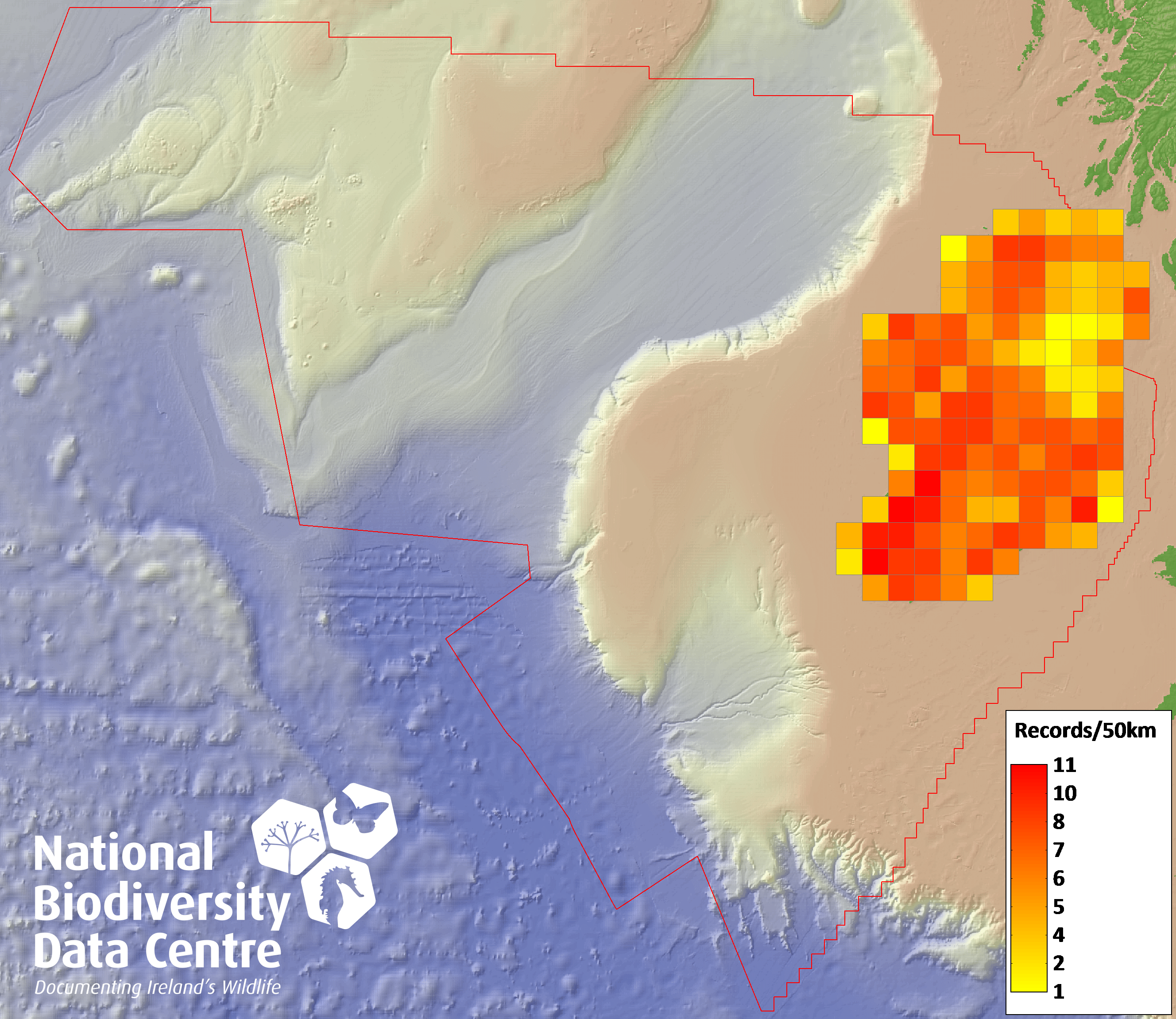 Distribution of the number of records recorded within each 10km grid square (ITM).Marine Map - 50km
