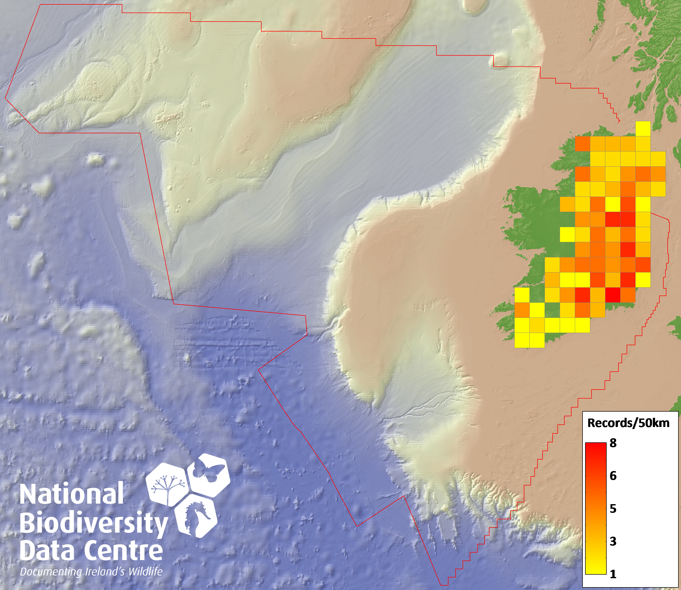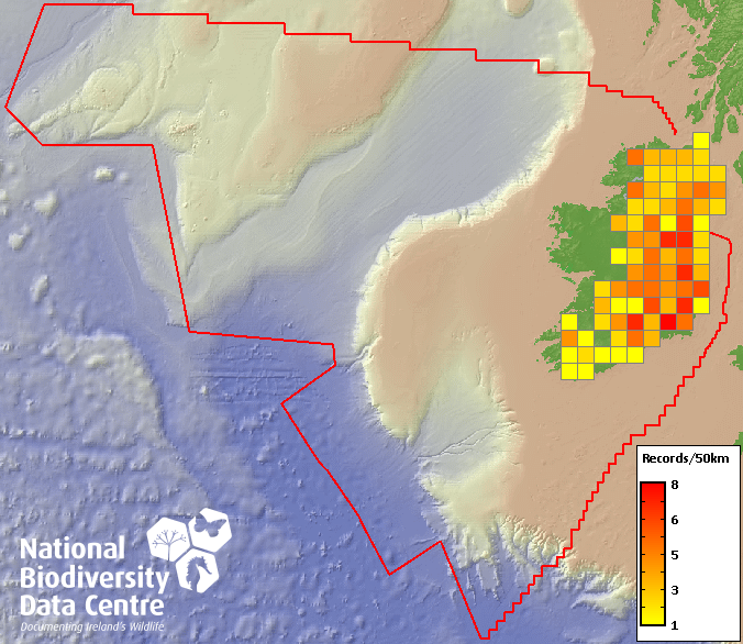 Distribution of the number of records recorded within each 10km grid square (ITM).Marine Map - 50km