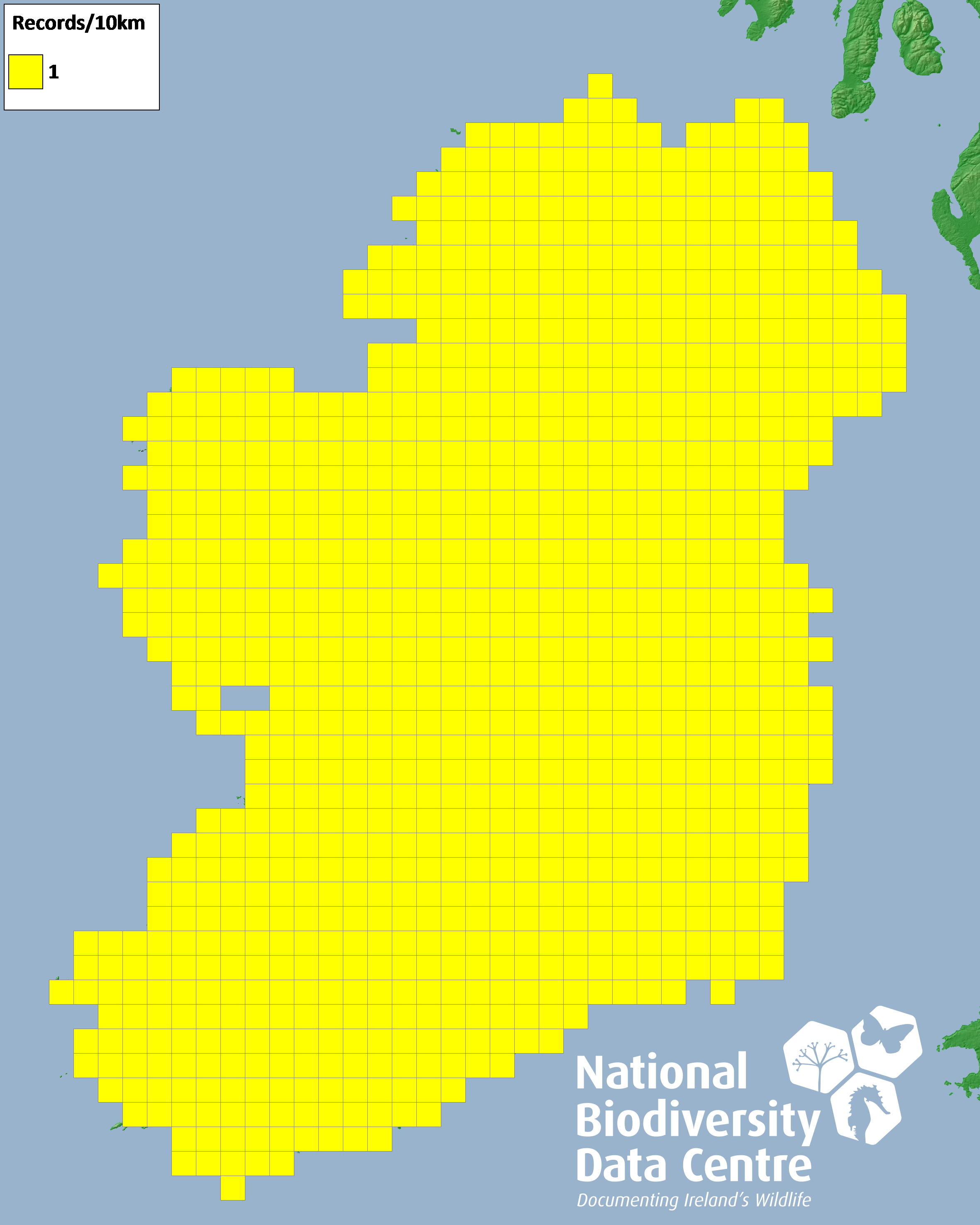 Distribution of the number of records recorded within each 10km grid square (ITM).Marine Map - 50km