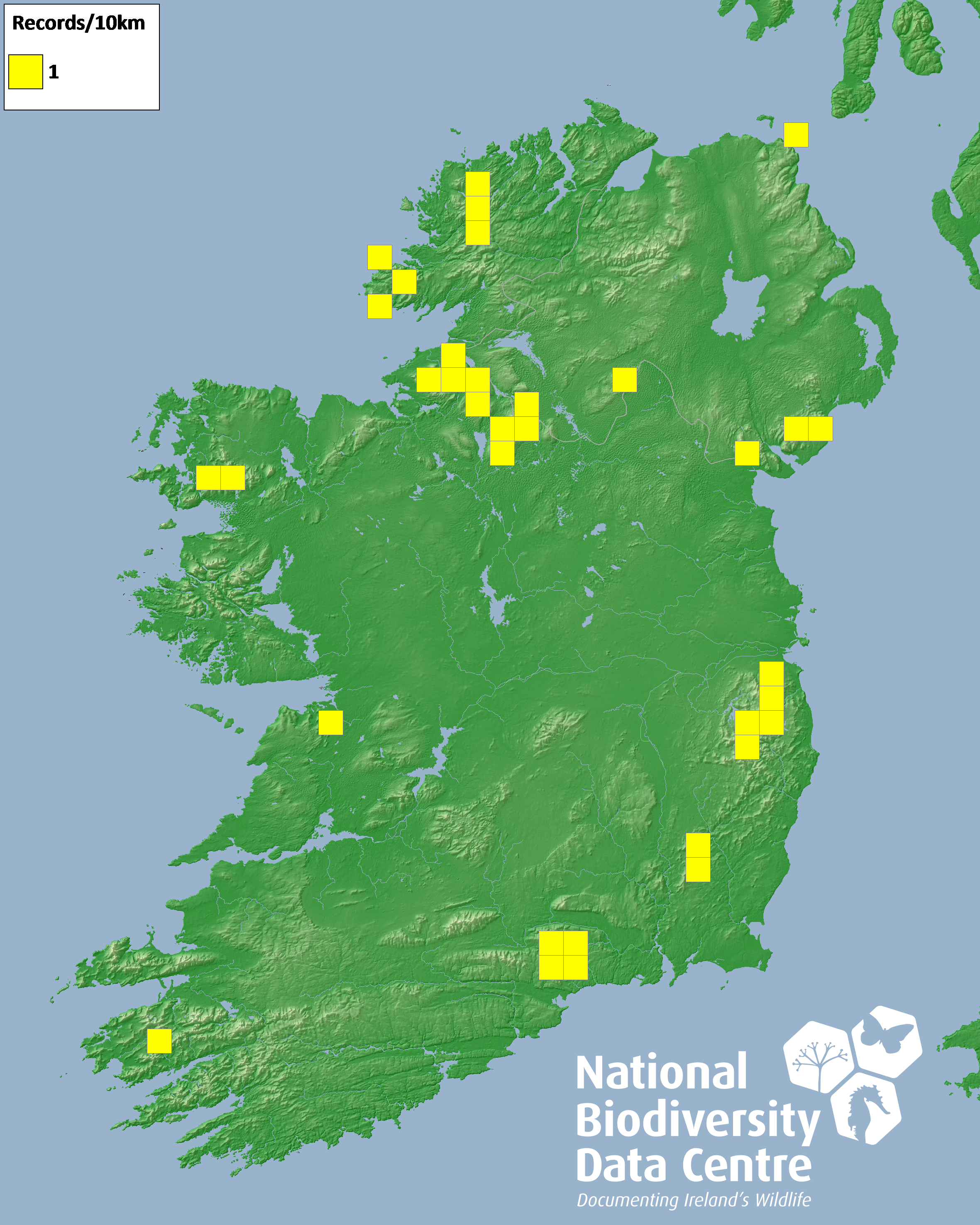 Distribution of the number of records recorded within each 10km grid square (ITM).Marine Map - 50km
