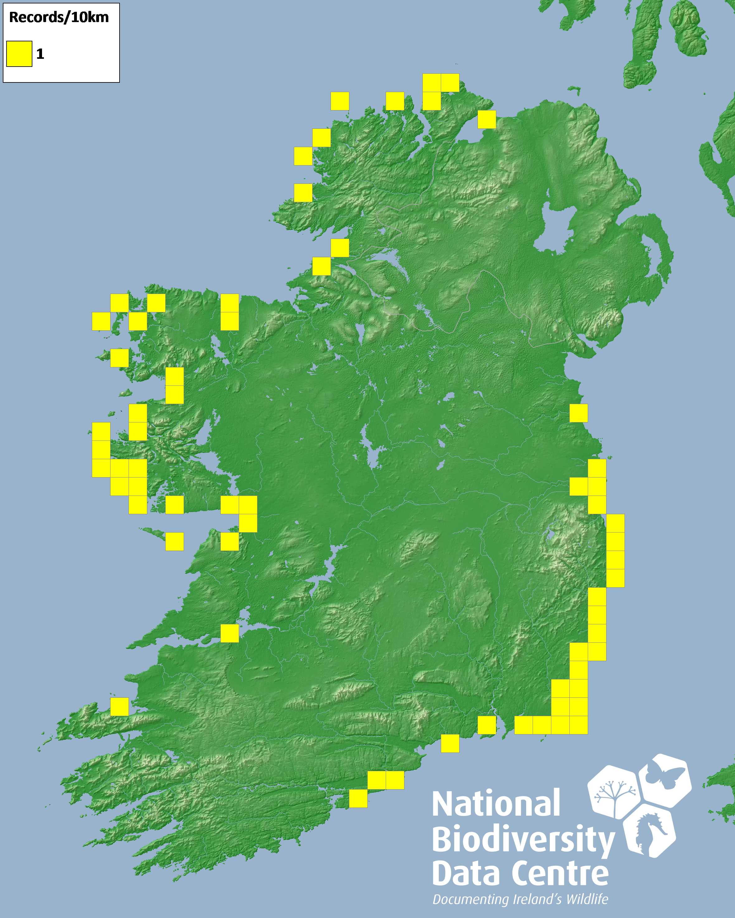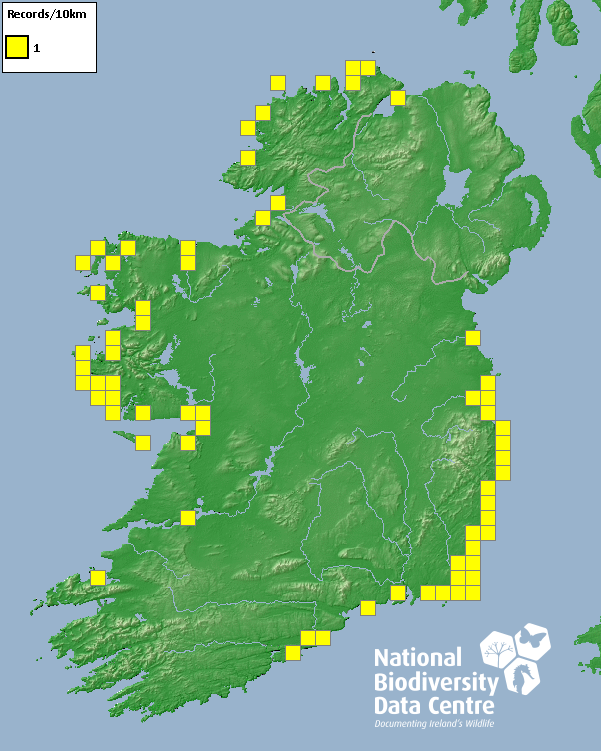 Distribution of the number of records recorded within each 10km grid square (ITM).Marine Map - 50km