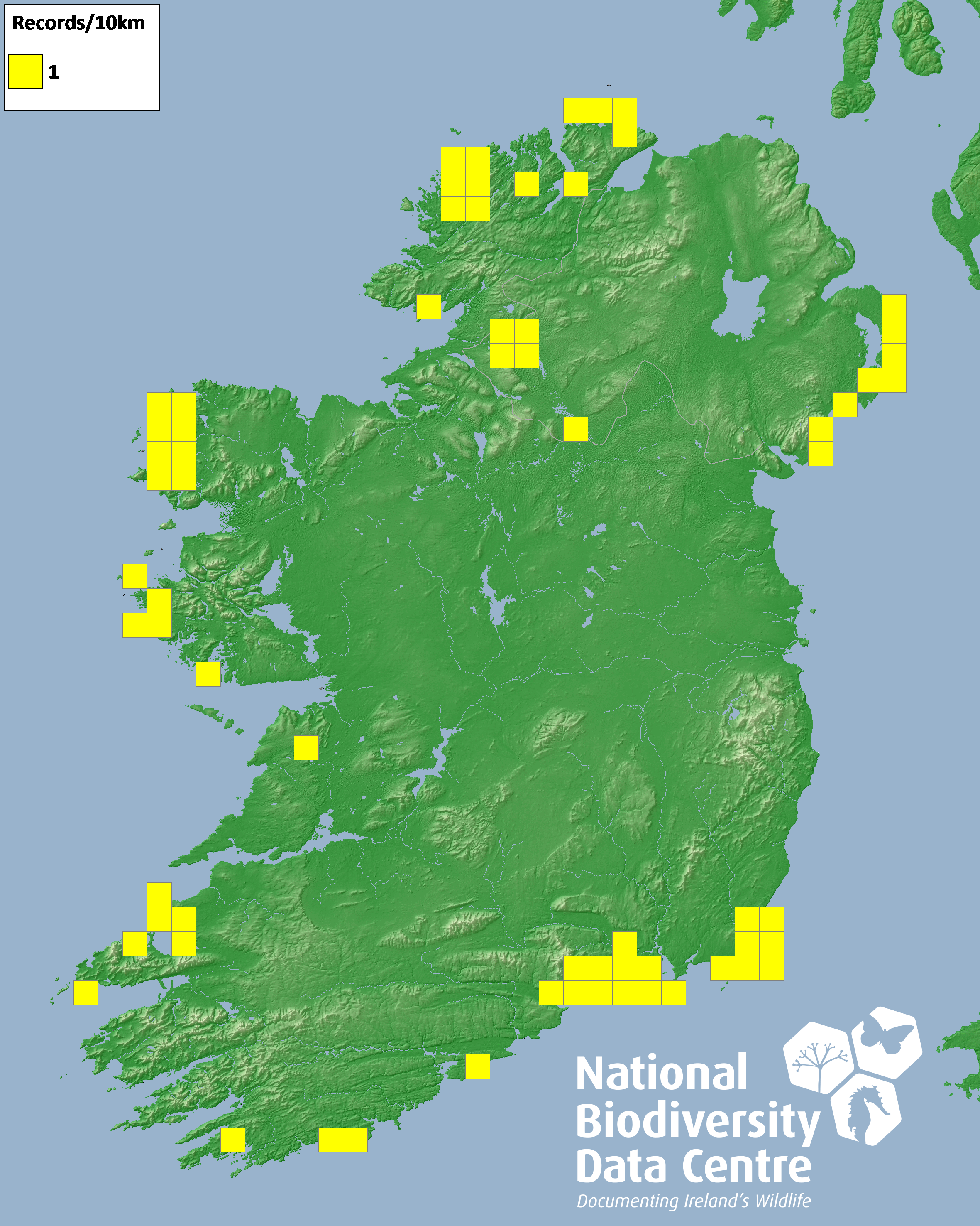 Distribution of the number of records recorded within each 10km grid square (ITM).Marine Map - 50km