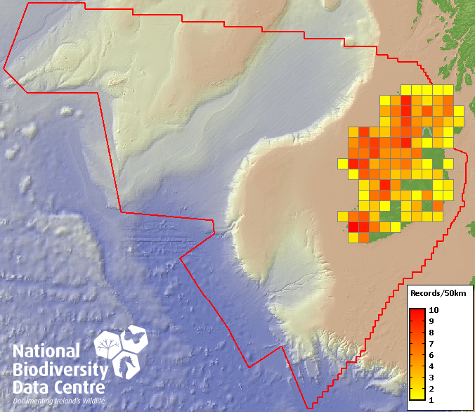 Distribution of the number of records recorded within each 10km grid square (ITM).Marine Map - 50km