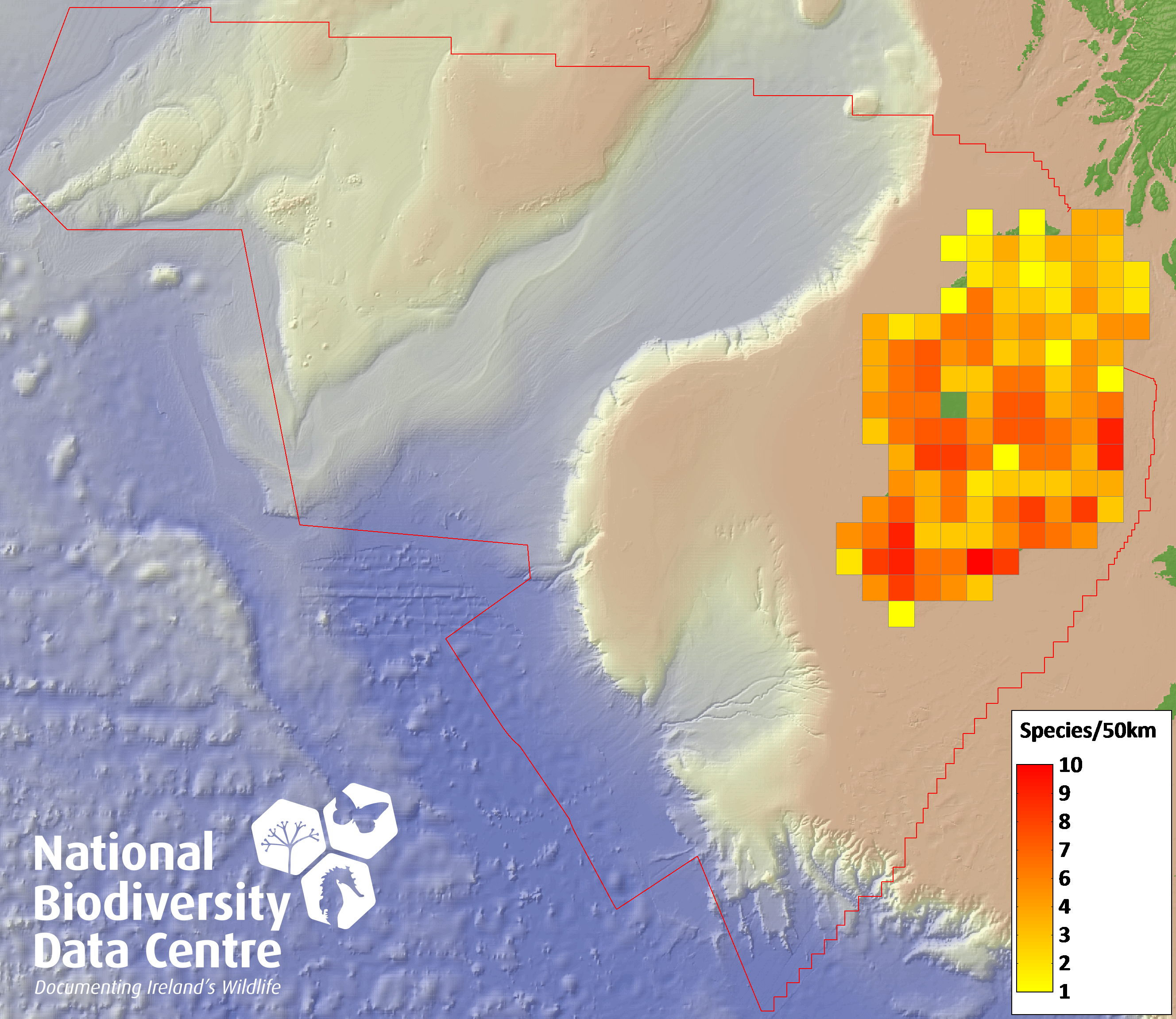Distribution of the number of species recorded within each 10km grid square (ITM).Marine Map - 50Km