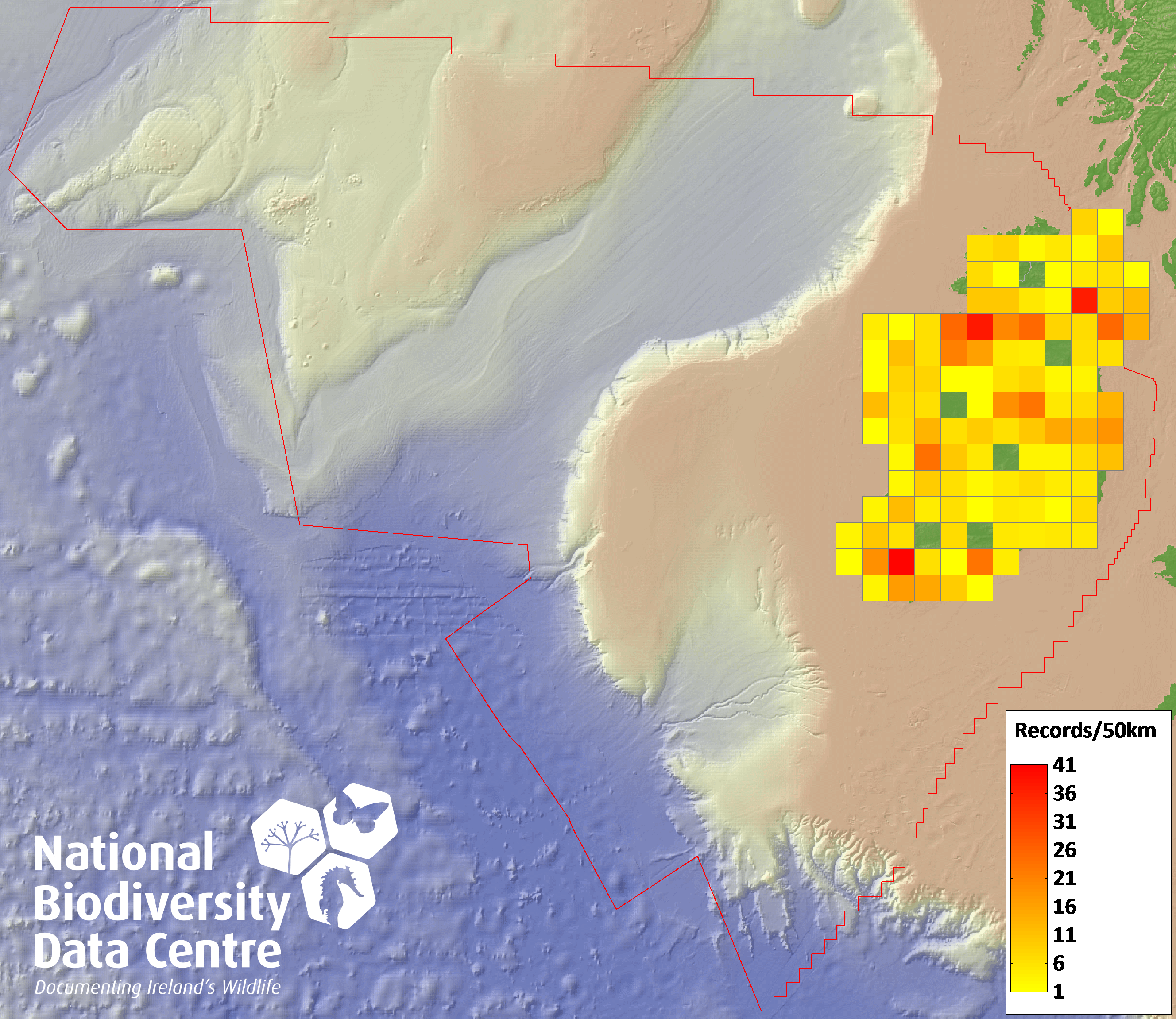 Distribution of the number of records recorded within each 10km grid square (ITM).Marine Map - 50km