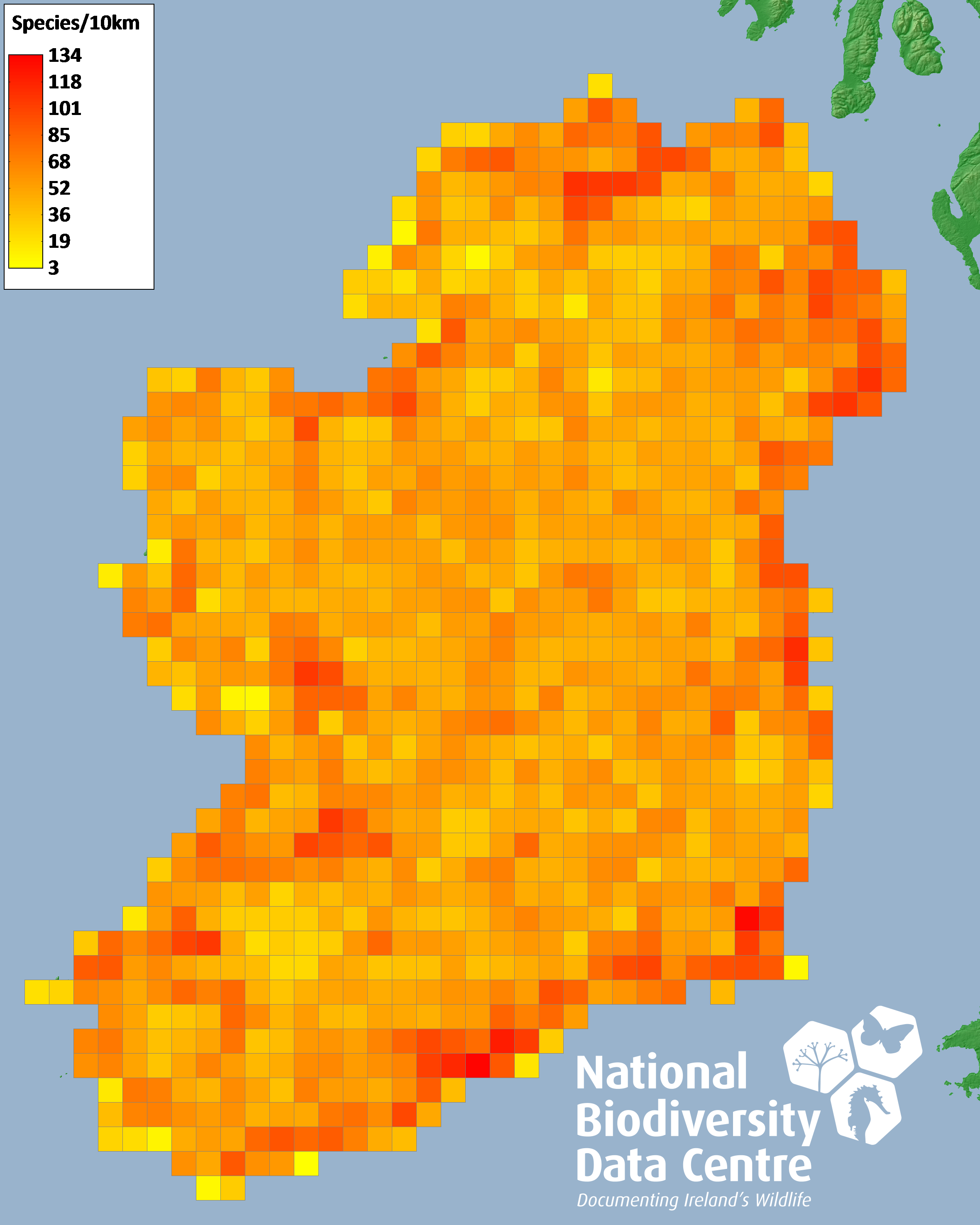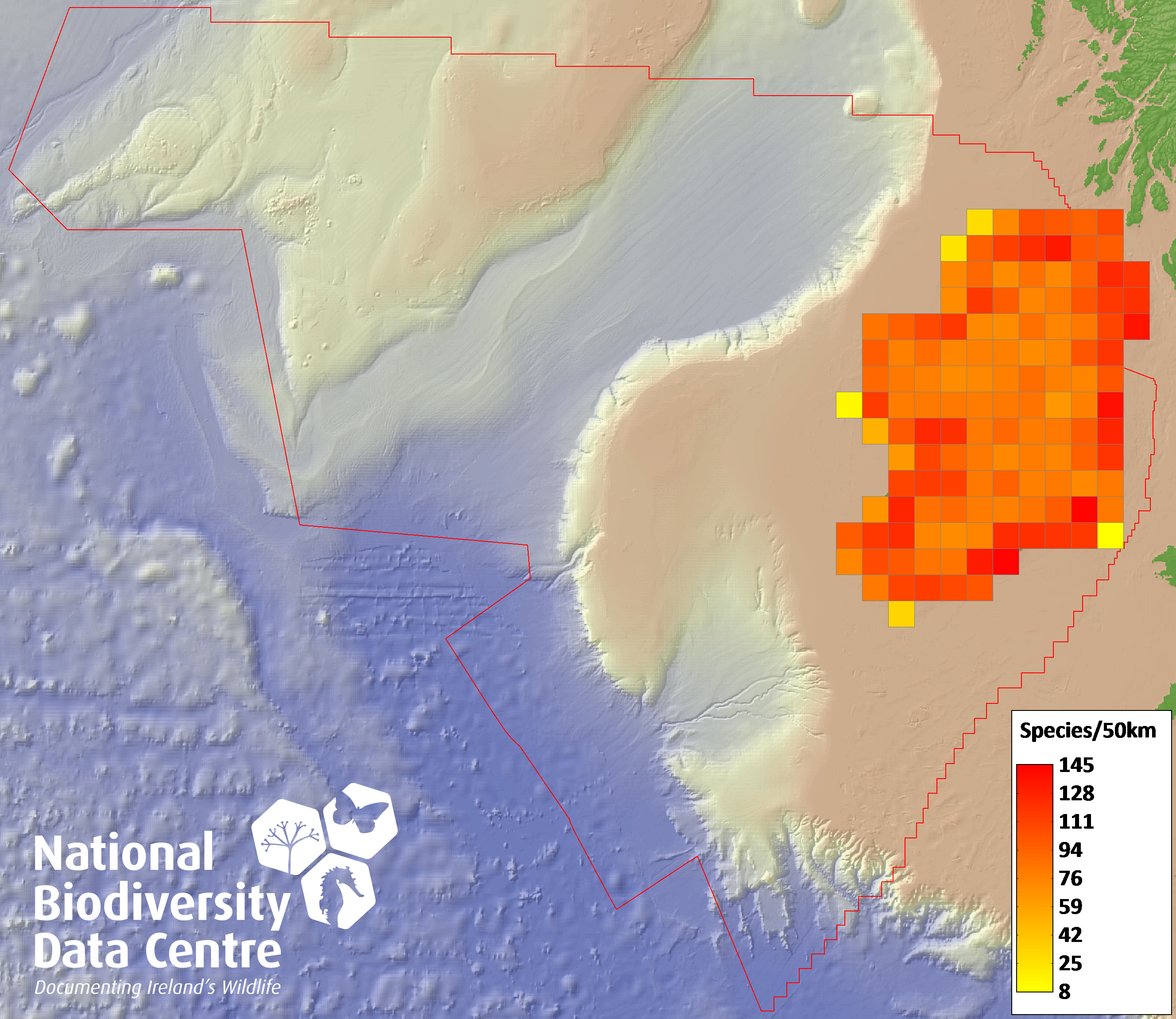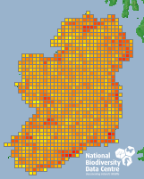Distribution of the number of species recorded within each 10km grid square (ITM).Marine Map - 50Km