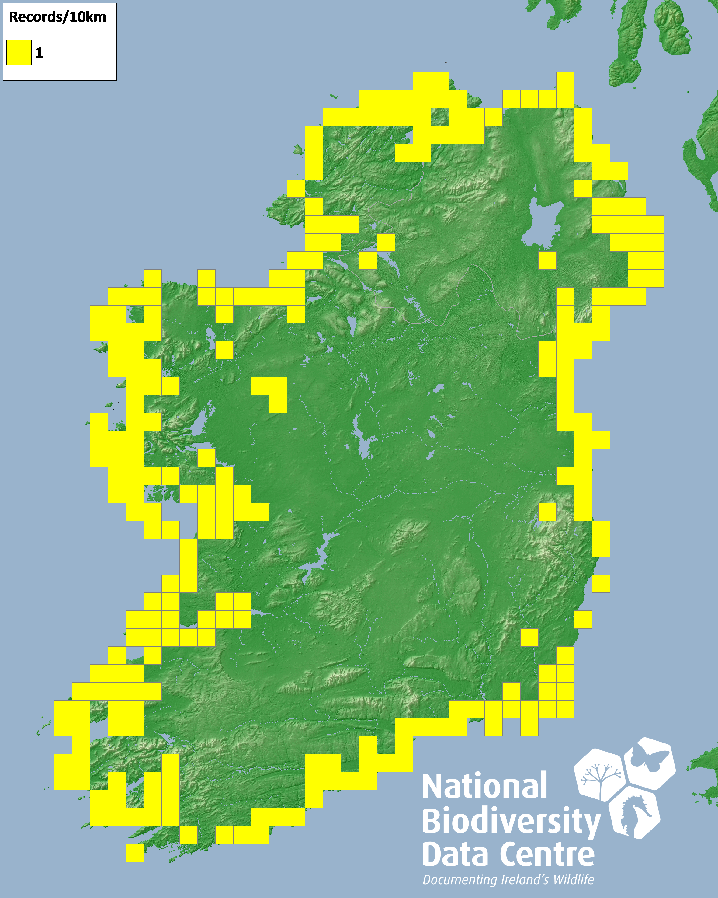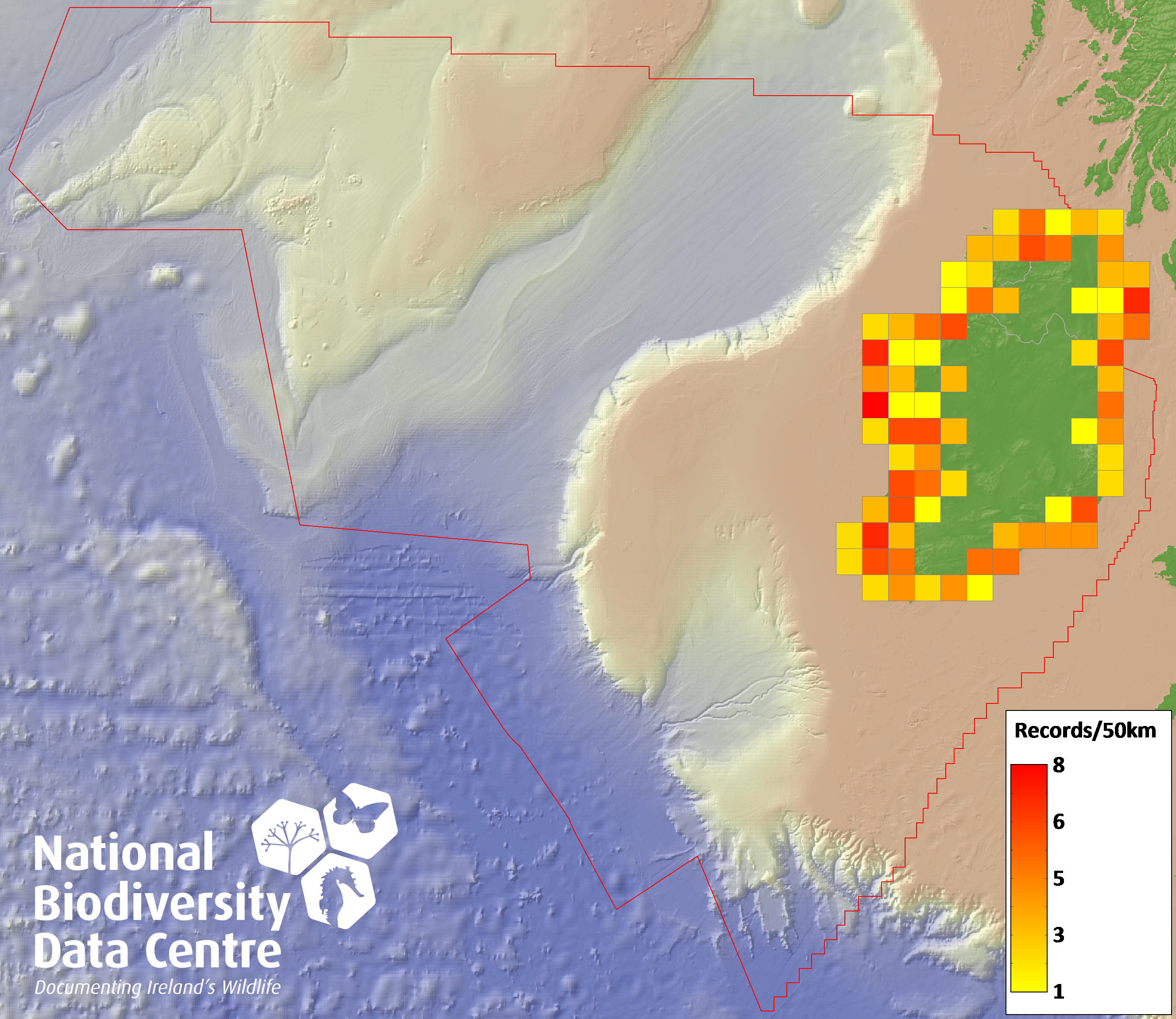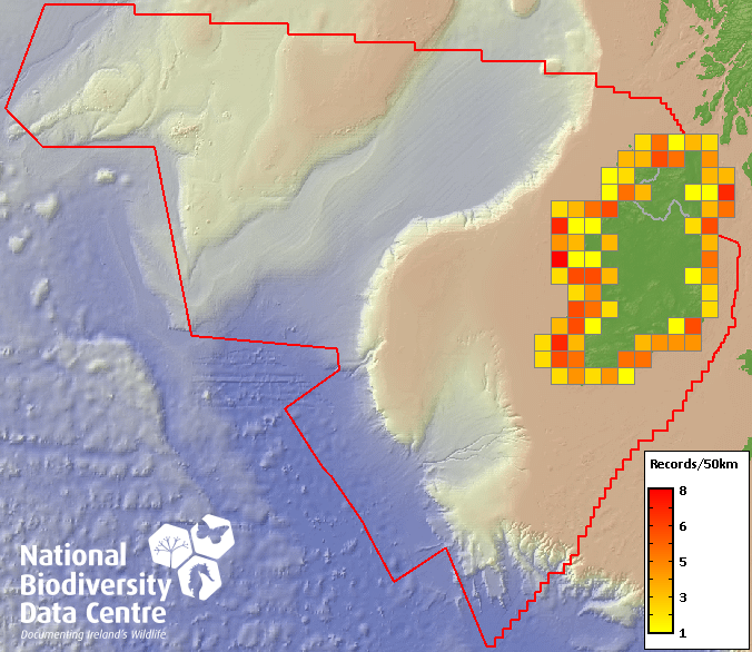 Distribution of the number of records recorded within each 10km grid square (ITM).Marine Map - 50km