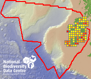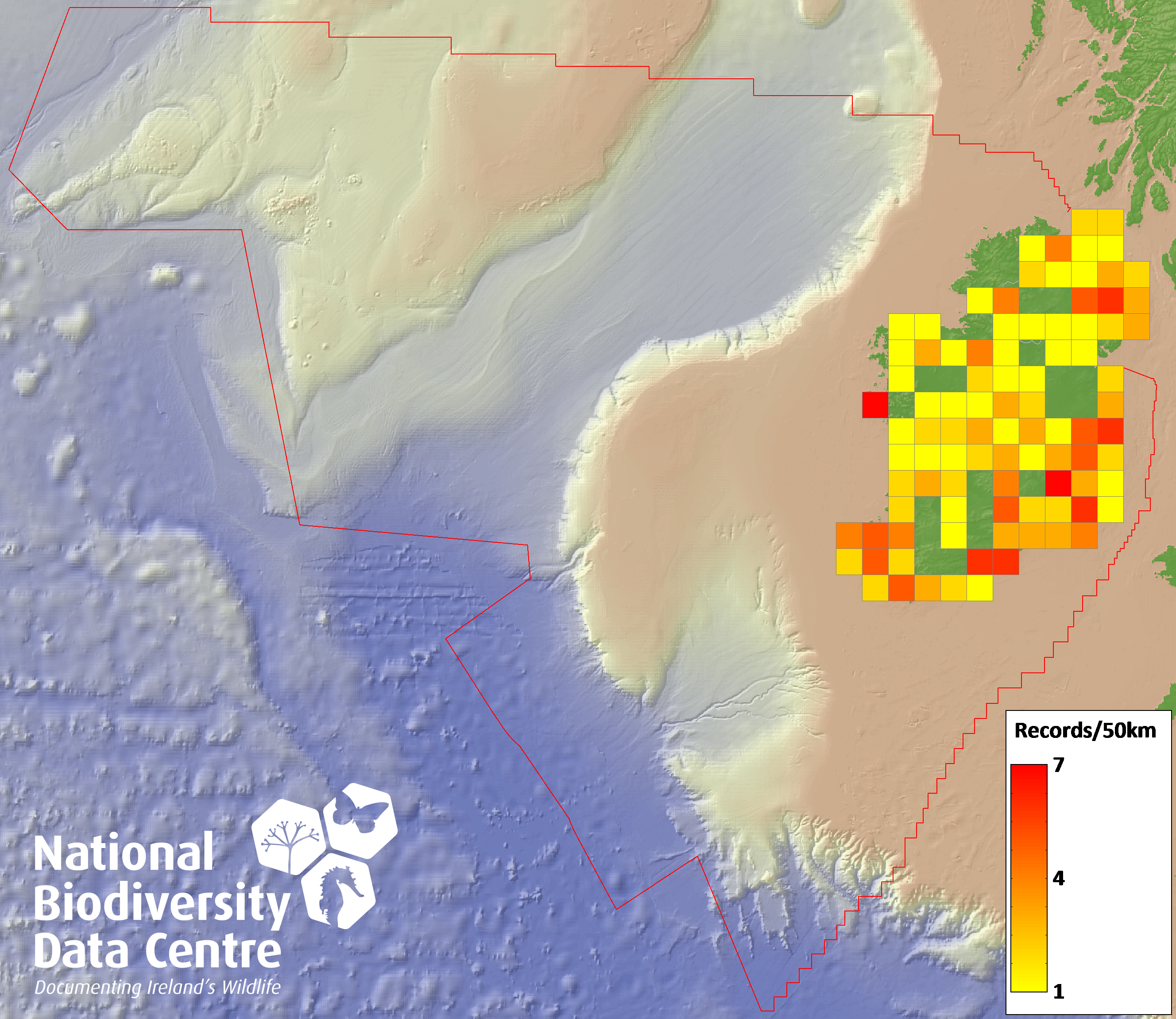 Distribution of the number of records recorded within each 10km grid square (ITM).Marine Map - 50km