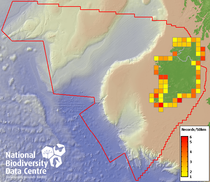 Distribution of the number of records recorded within each 10km grid square (ITM).Marine Map - 50km