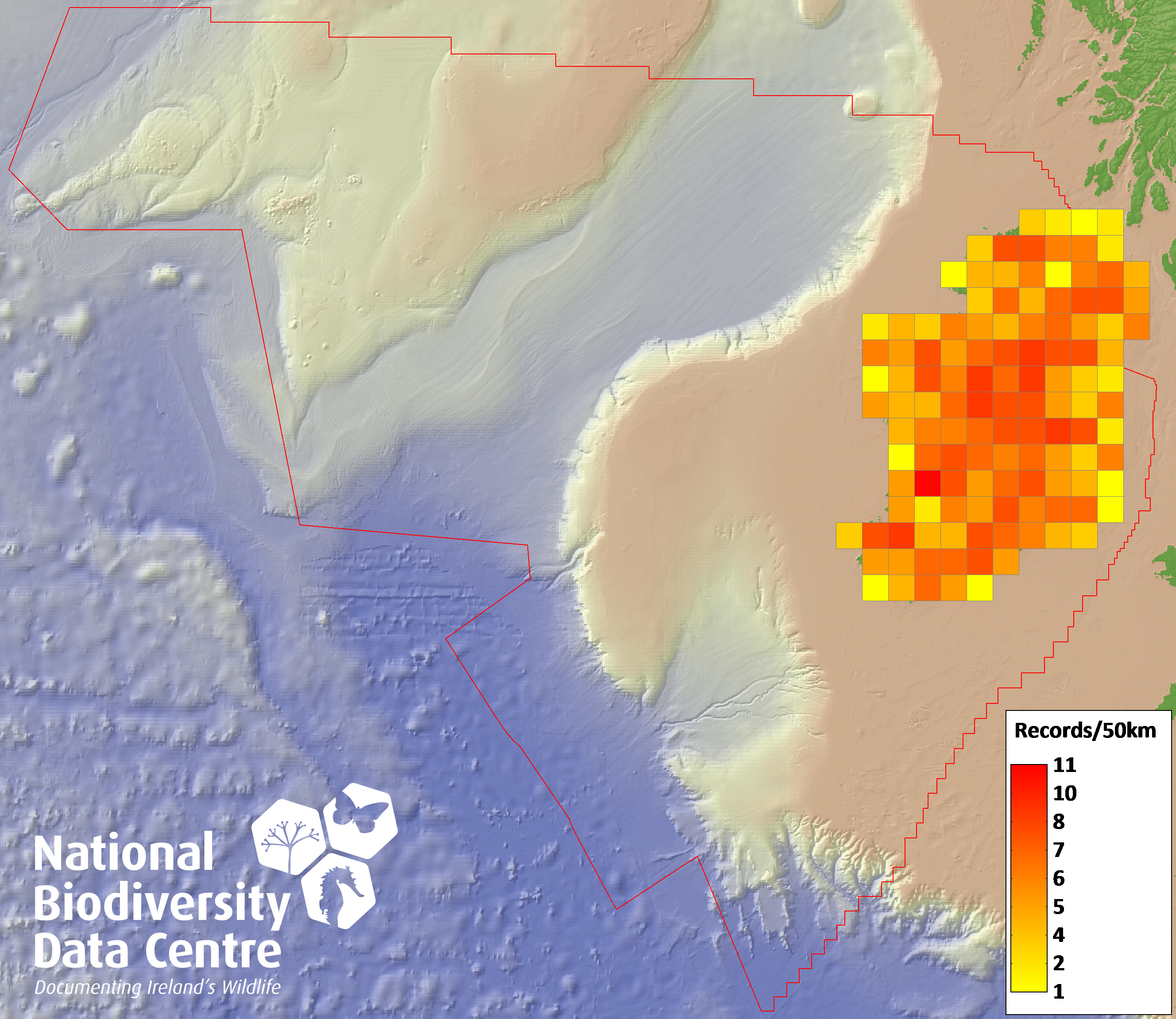 Distribution of the number of records recorded within each 10km grid square (ITM).Marine Map - 50km