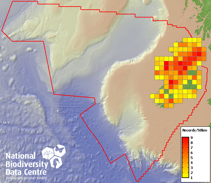 Distribution of the number of records recorded within each 10km grid square (ITM).Marine Map - 50km