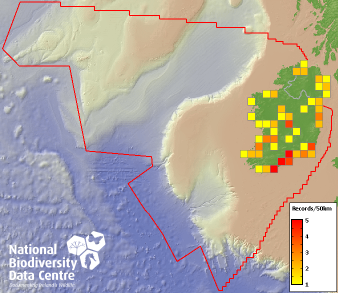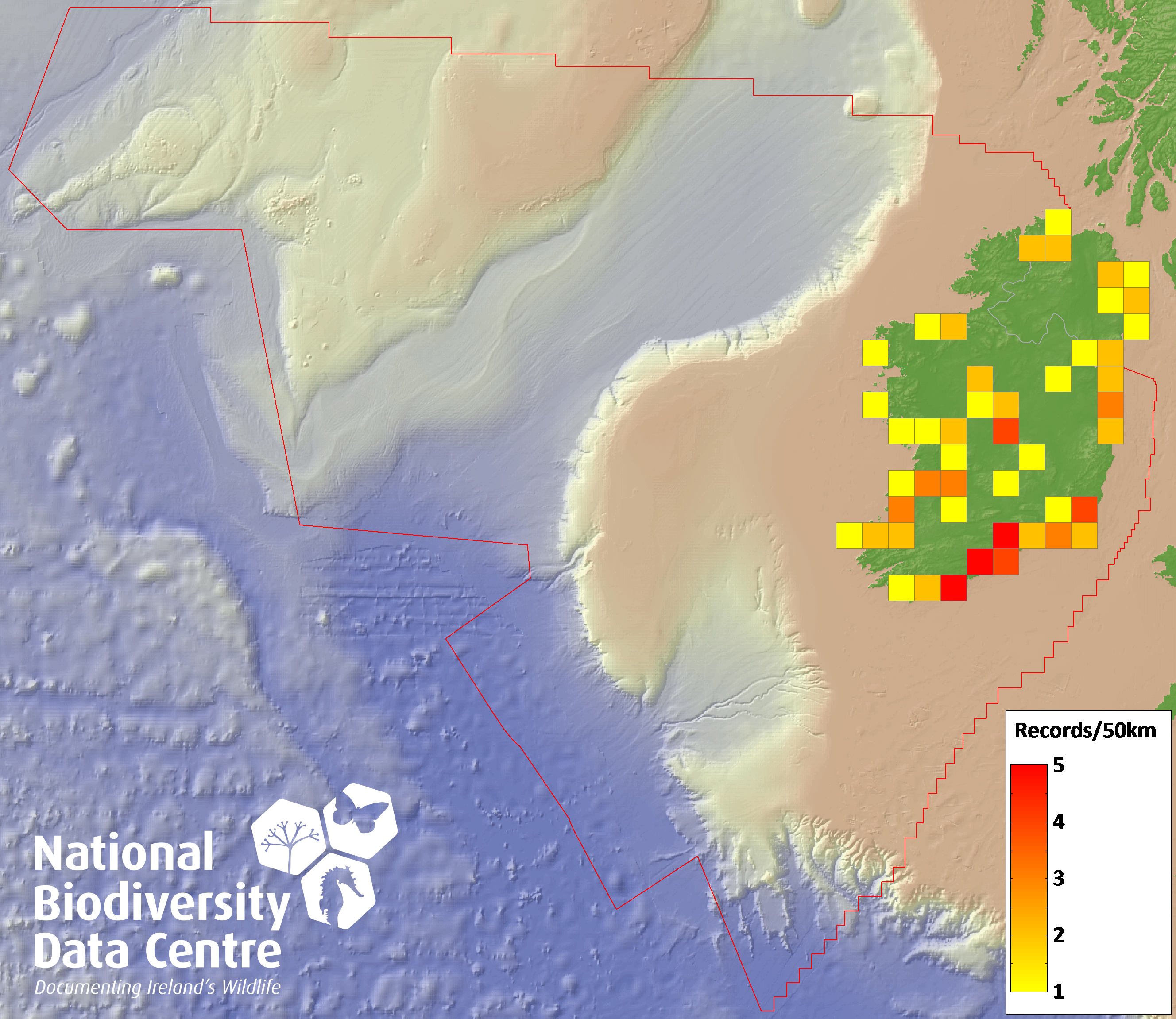Distribution of the number of records recorded within each 10km grid square (ITM).Marine Map - 50km