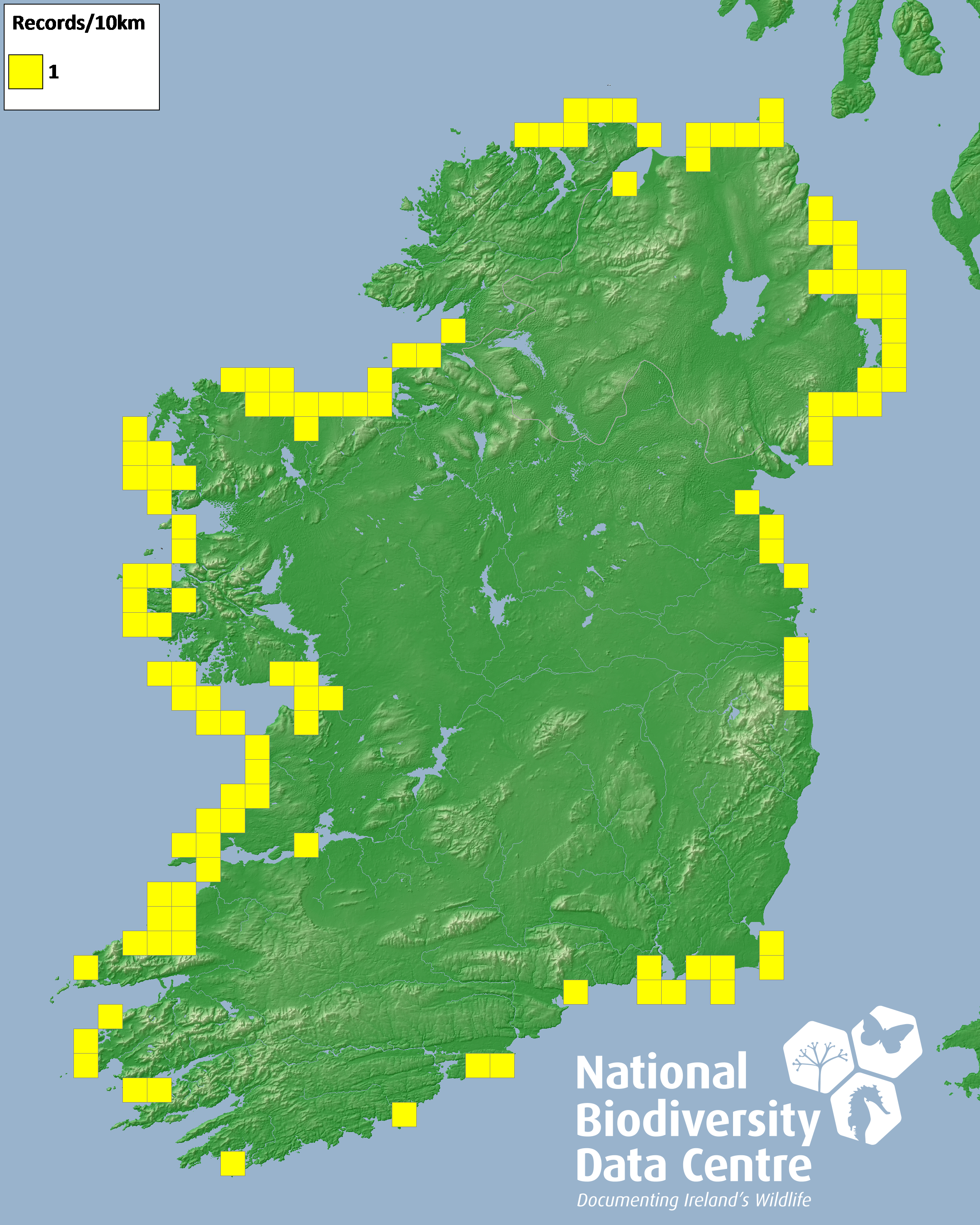 Distribution of the number of records recorded within each 10km grid square (ITM).Marine Map - 50km