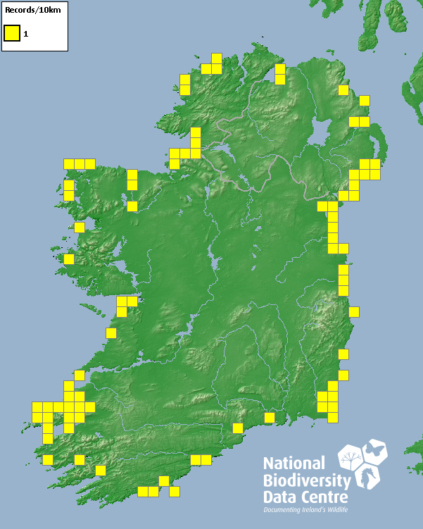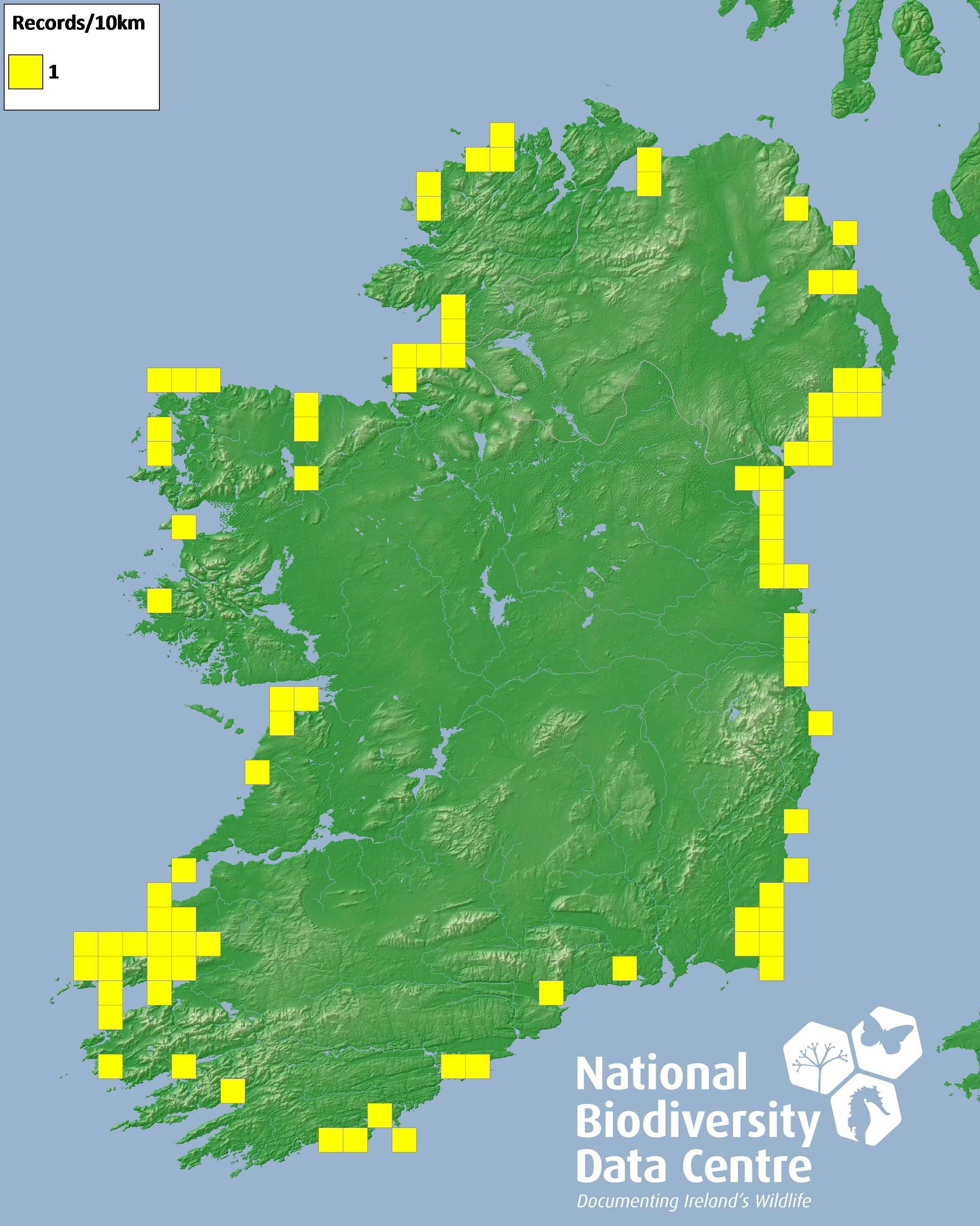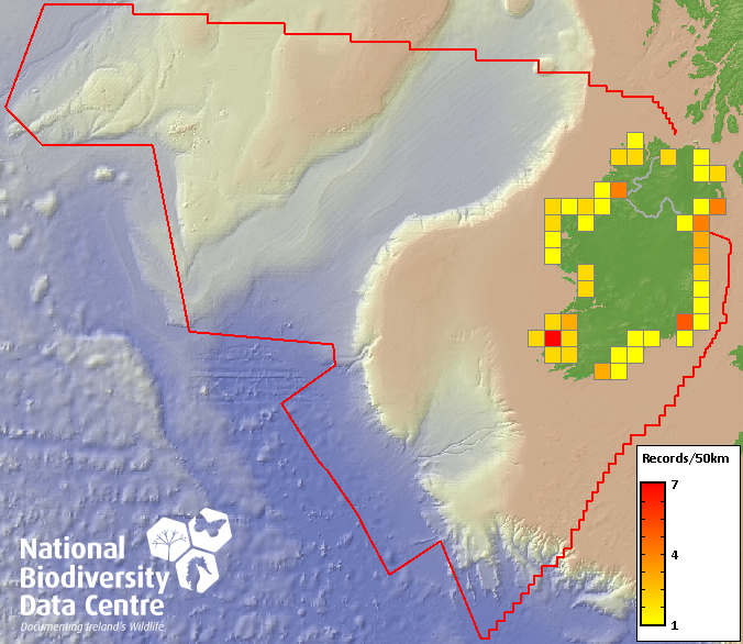 Distribution of the number of records recorded within each 10km grid square (ITM).Marine Map - 50km