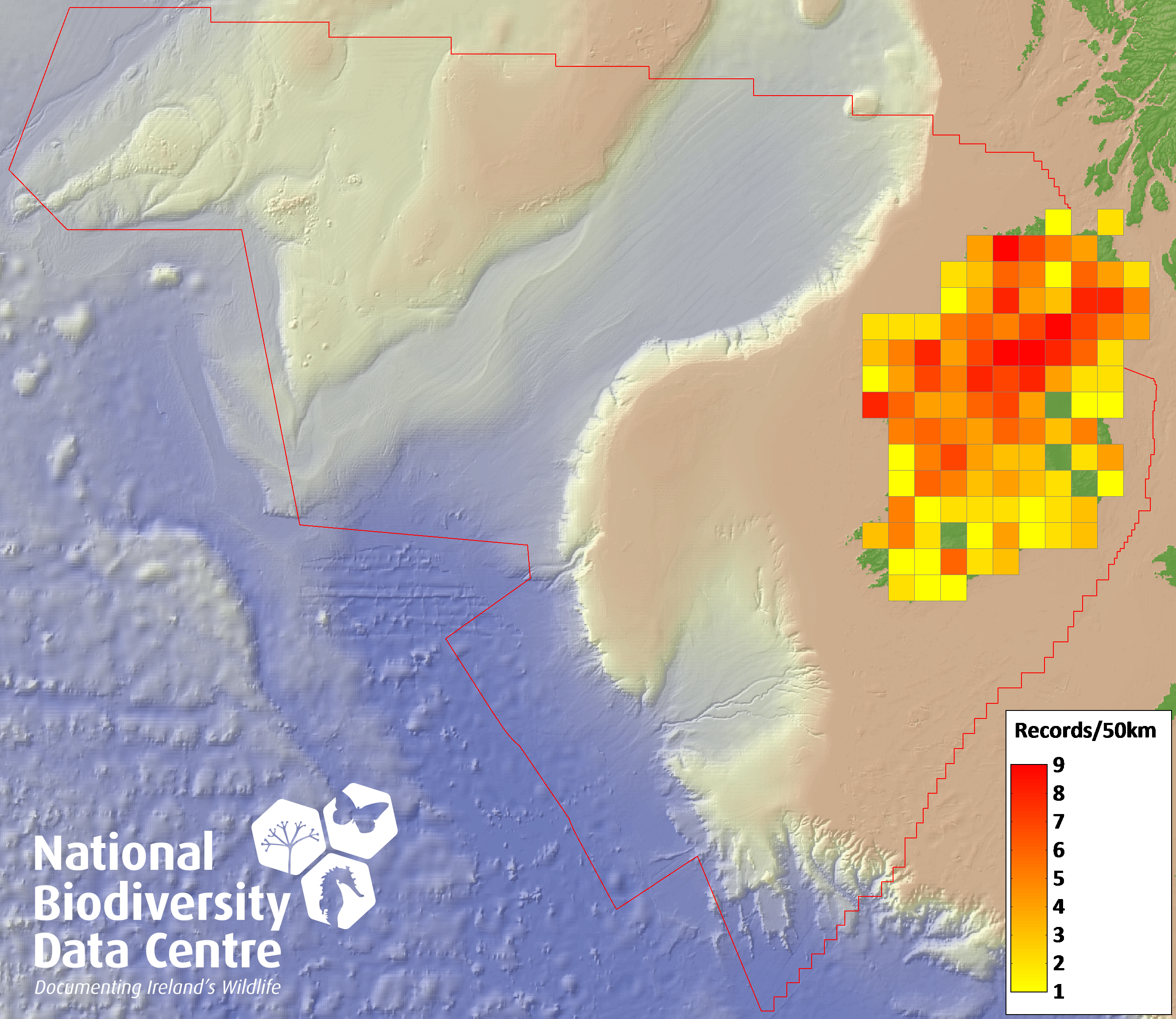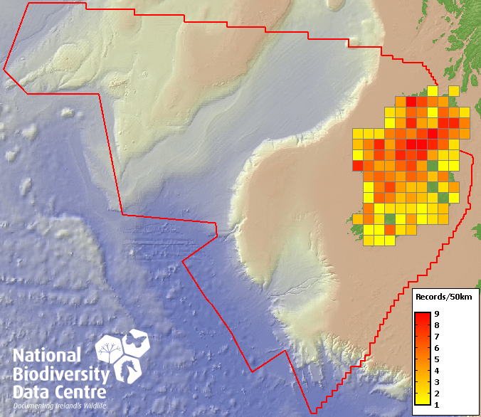 Distribution of the number of records recorded within each 10km grid square (ITM).Marine Map - 50km