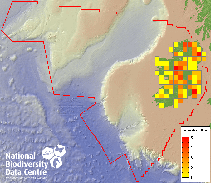 Distribution of the number of records recorded within each 10km grid square (ITM).Marine Map - 50km
