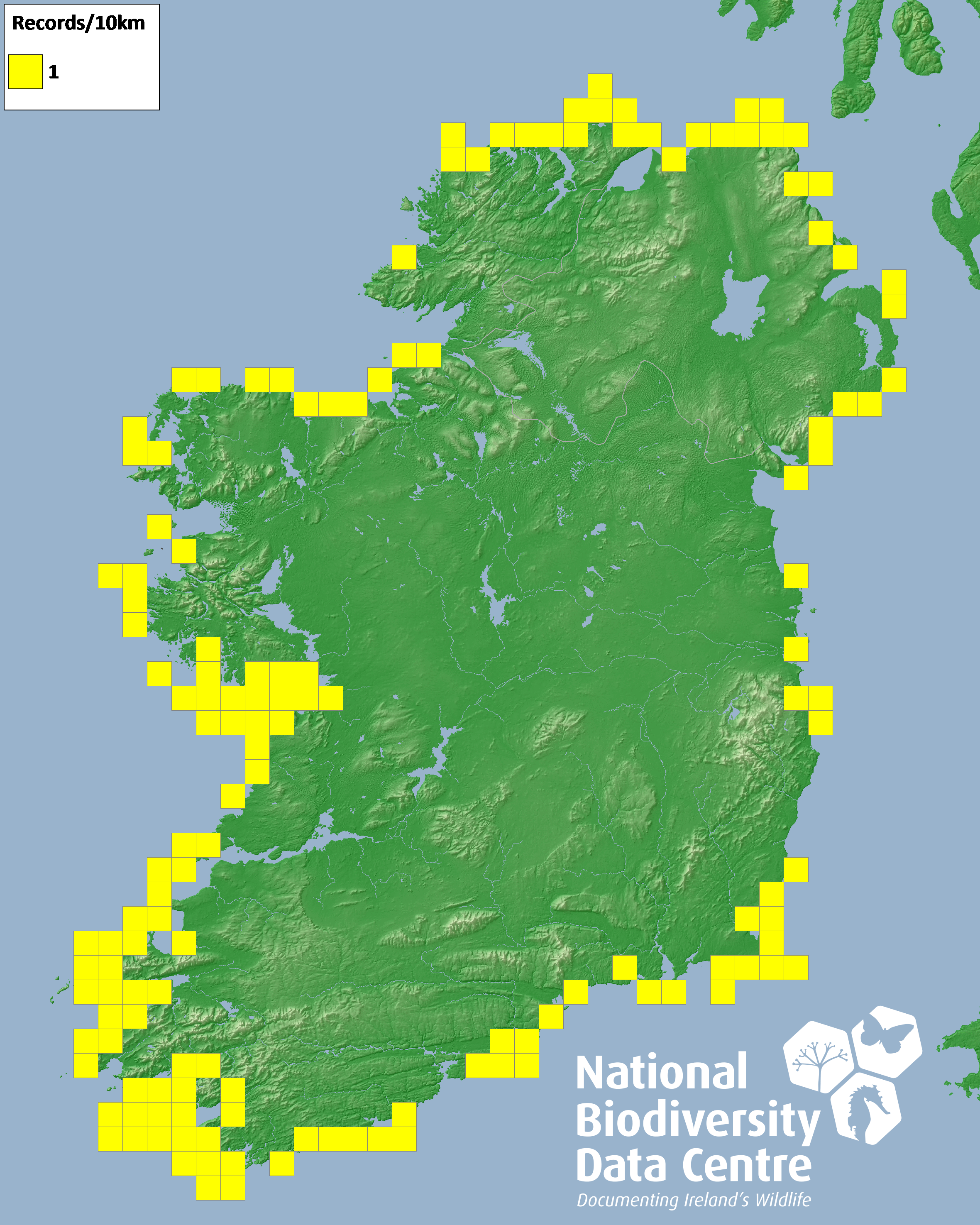Distribution of the number of records recorded within each 10km grid square (ITM).Marine Map - 50km