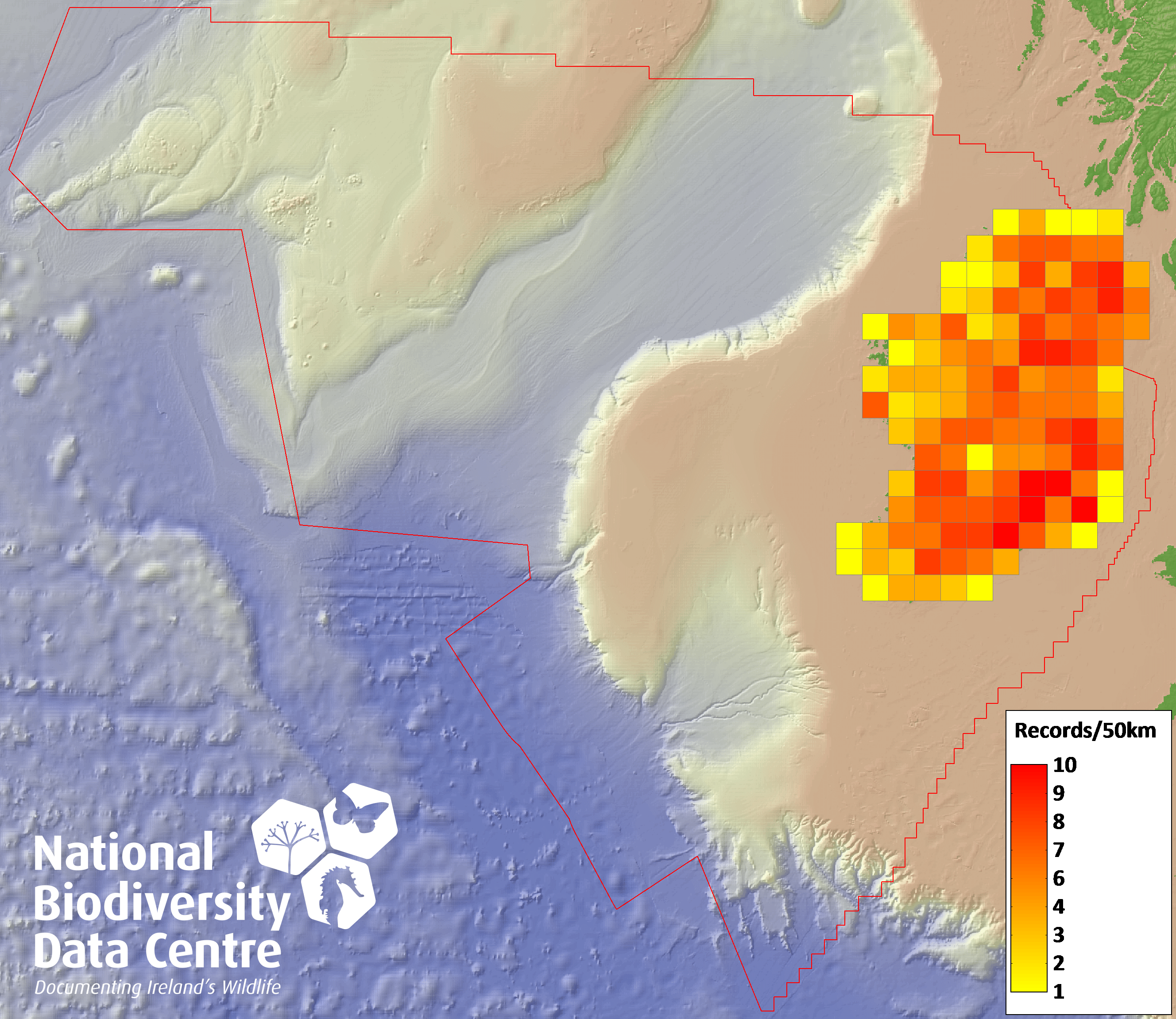 Distribution of the number of records recorded within each 10km grid square (ITM).Marine Map - 50km