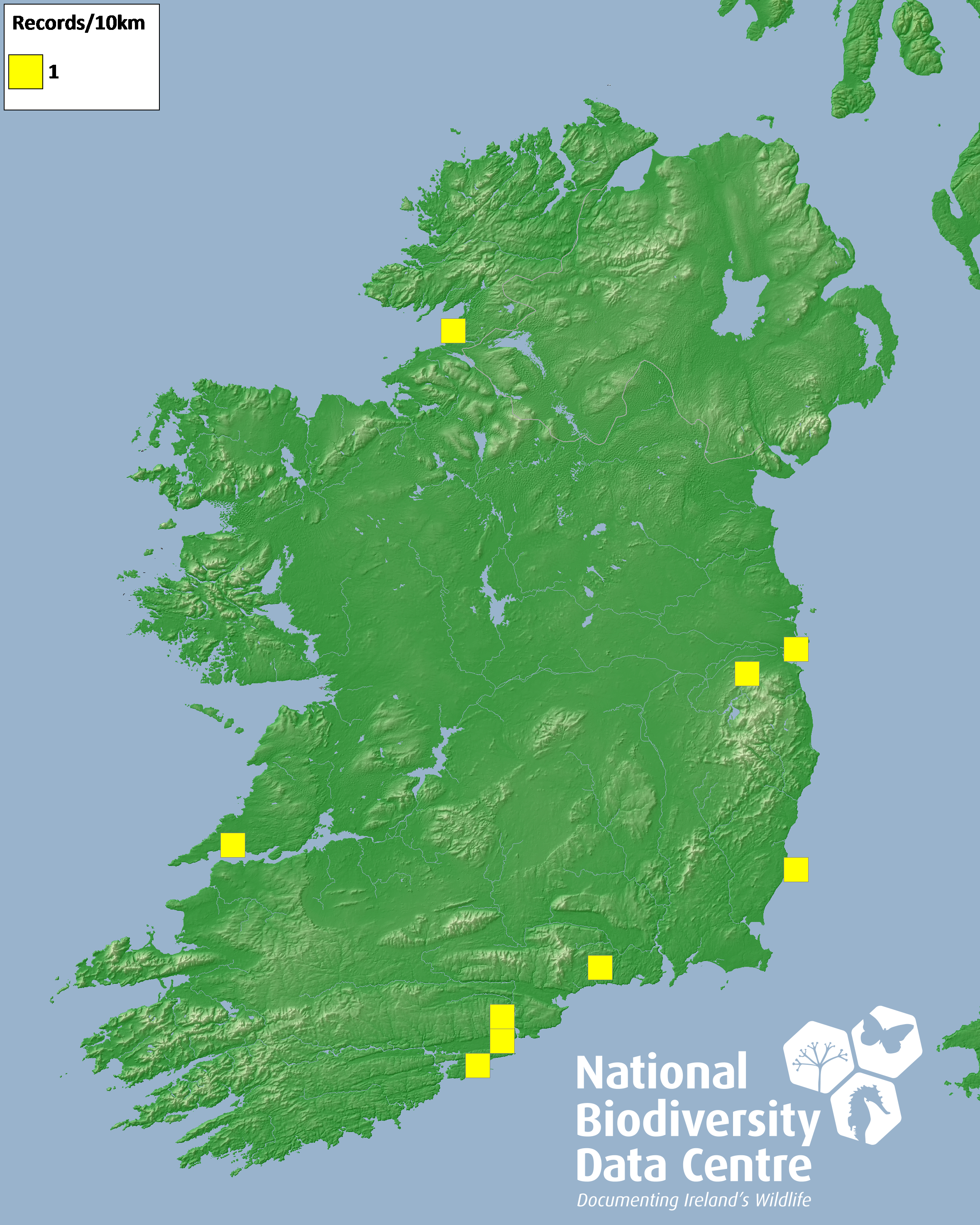 Distribution of the number of records recorded within each 10km grid square (ITM).Marine Map - 50km
