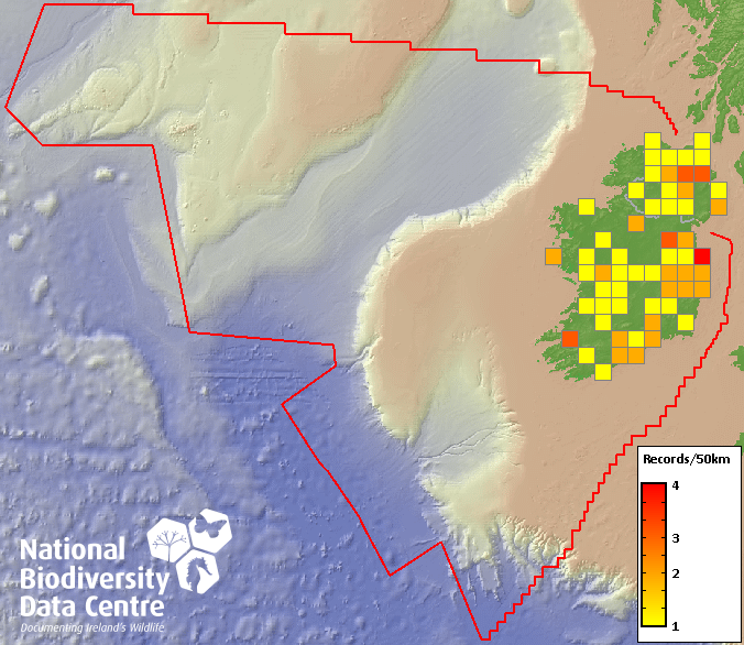 Distribution of the number of records recorded within each 10km grid square (ITM).Marine Map - 50km