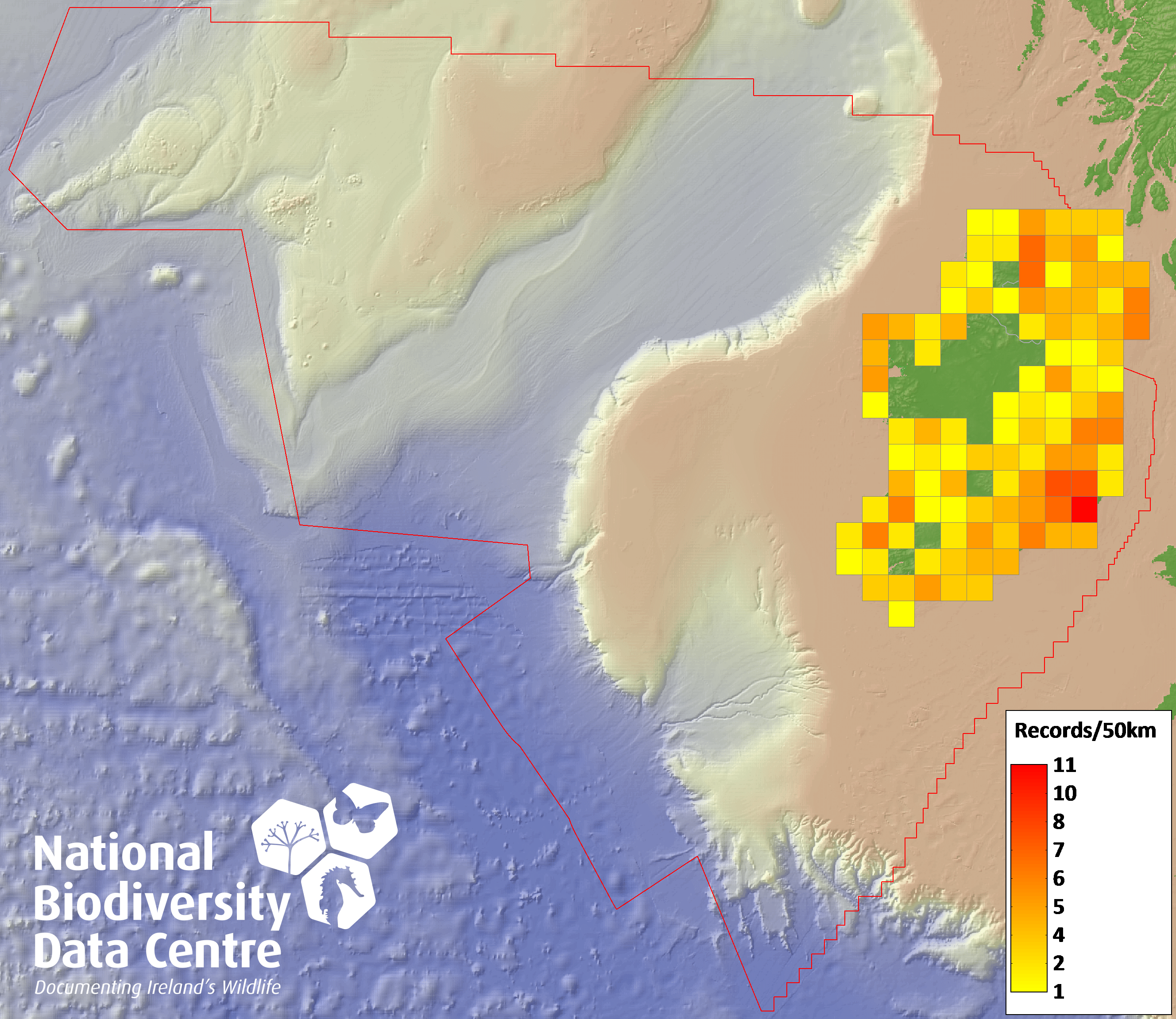 Distribution of the number of records recorded within each 10km grid square (ITM).Marine Map - 50km