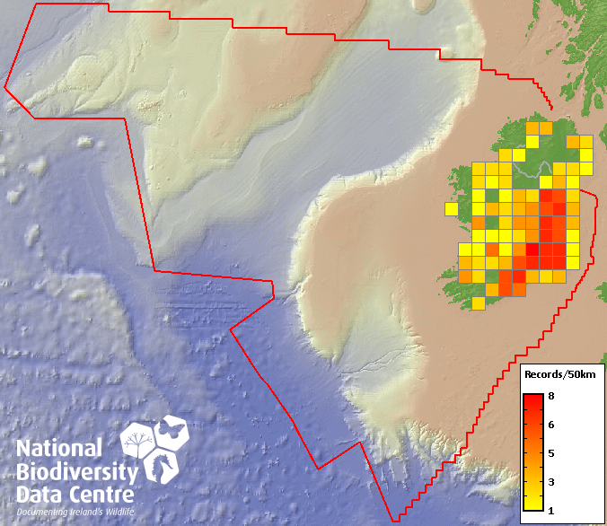 Distribution of the number of records recorded within each 10km grid square (ITM).Marine Map - 50km