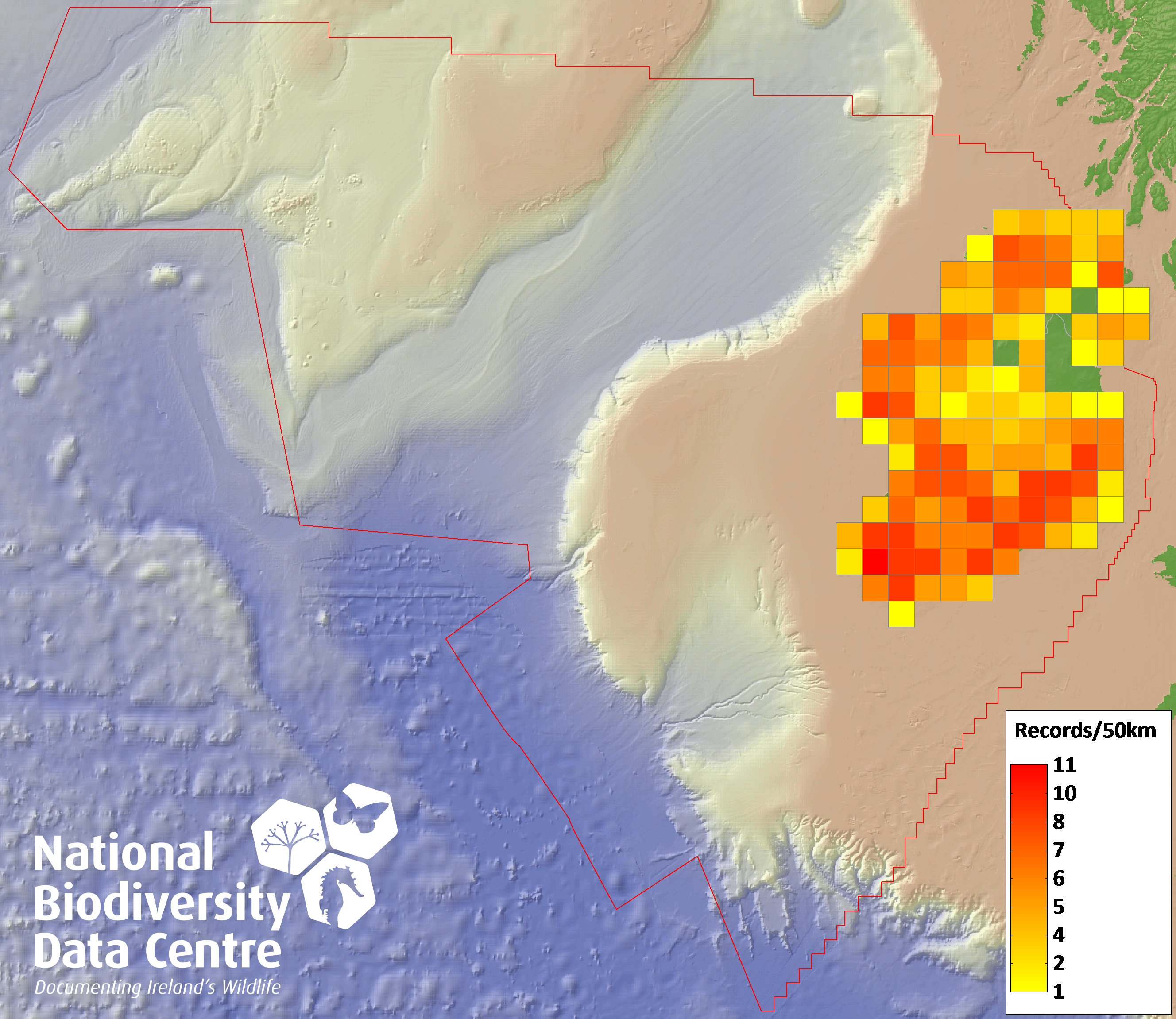 Distribution of the number of records recorded within each 10km grid square (ITM).Marine Map - 50km