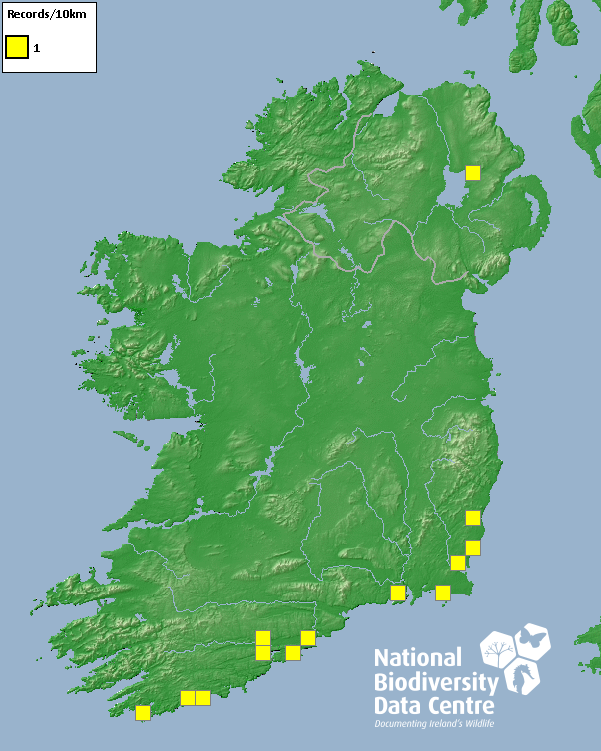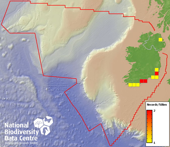 Distribution of the number of records recorded within each 10km grid square (ITM).Marine Map - 50km