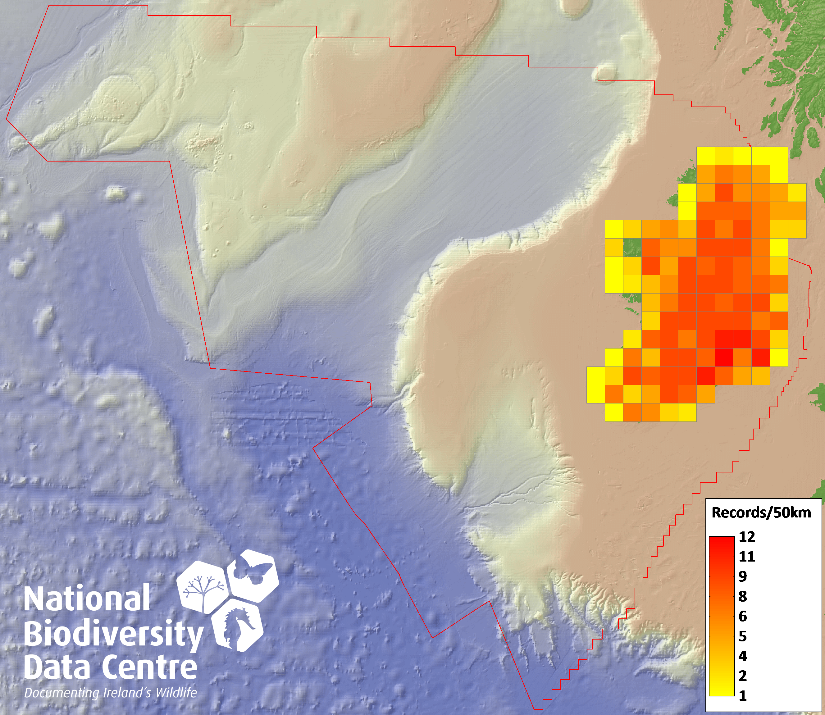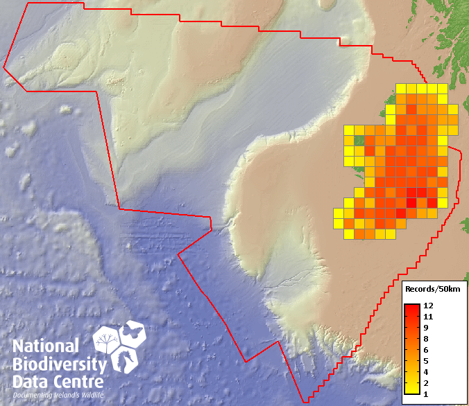 Distribution of the number of records recorded within each 10km grid square (ITM).Marine Map - 50km