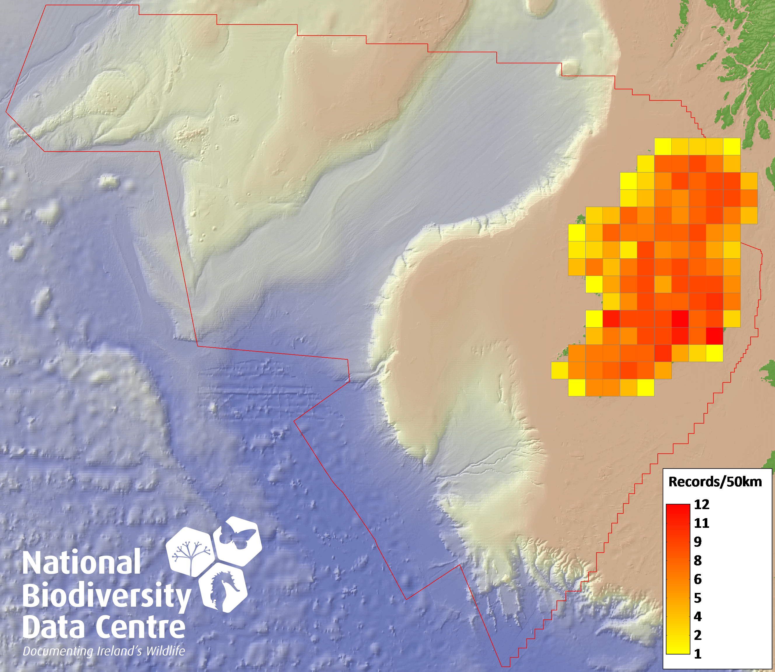 Distribution of the number of records recorded within each 10km grid square (ITM).Marine Map - 50km
