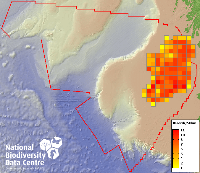 Distribution of the number of records recorded within each 10km grid square (ITM).Marine Map - 50km