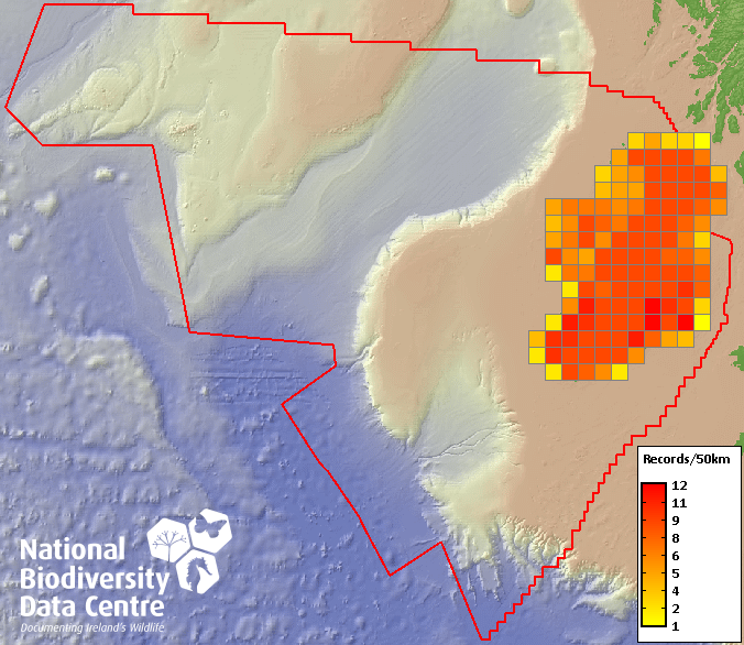 Distribution of the number of records recorded within each 10km grid square (ITM).Marine Map - 50km