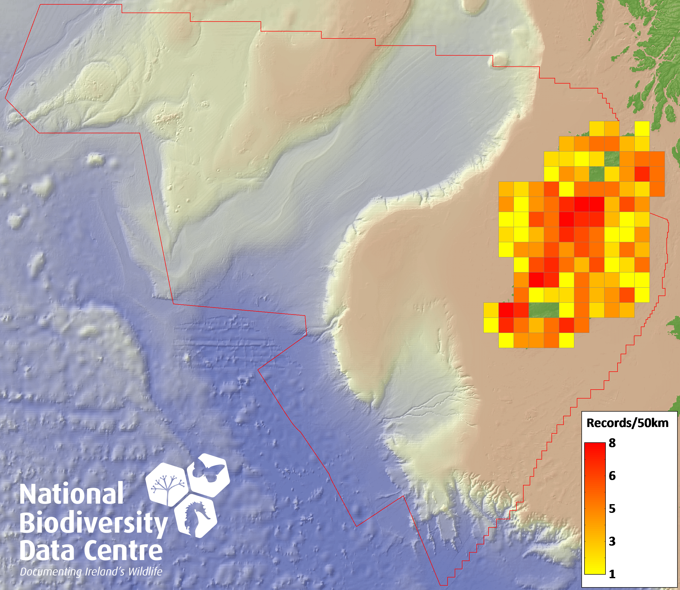 Distribution of the number of records recorded within each 10km grid square (ITM).Marine Map - 50km