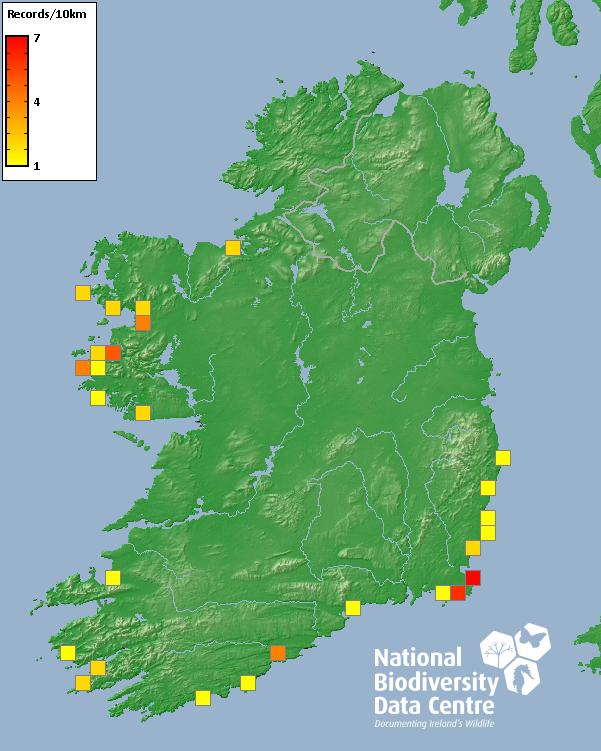 Distribution of the number of records recorded within each 10km grid square (ITM).Marine Map - 50km