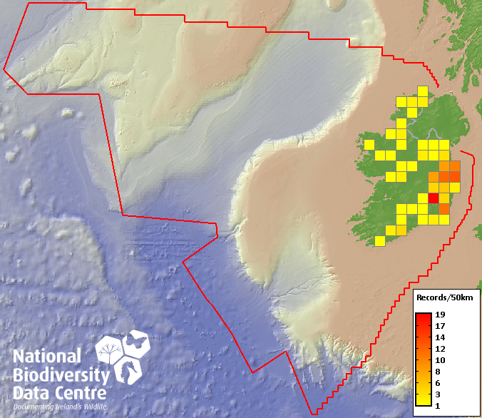 Distribution of the number of records recorded within each 10km grid square (ITM).Marine Map - 50km