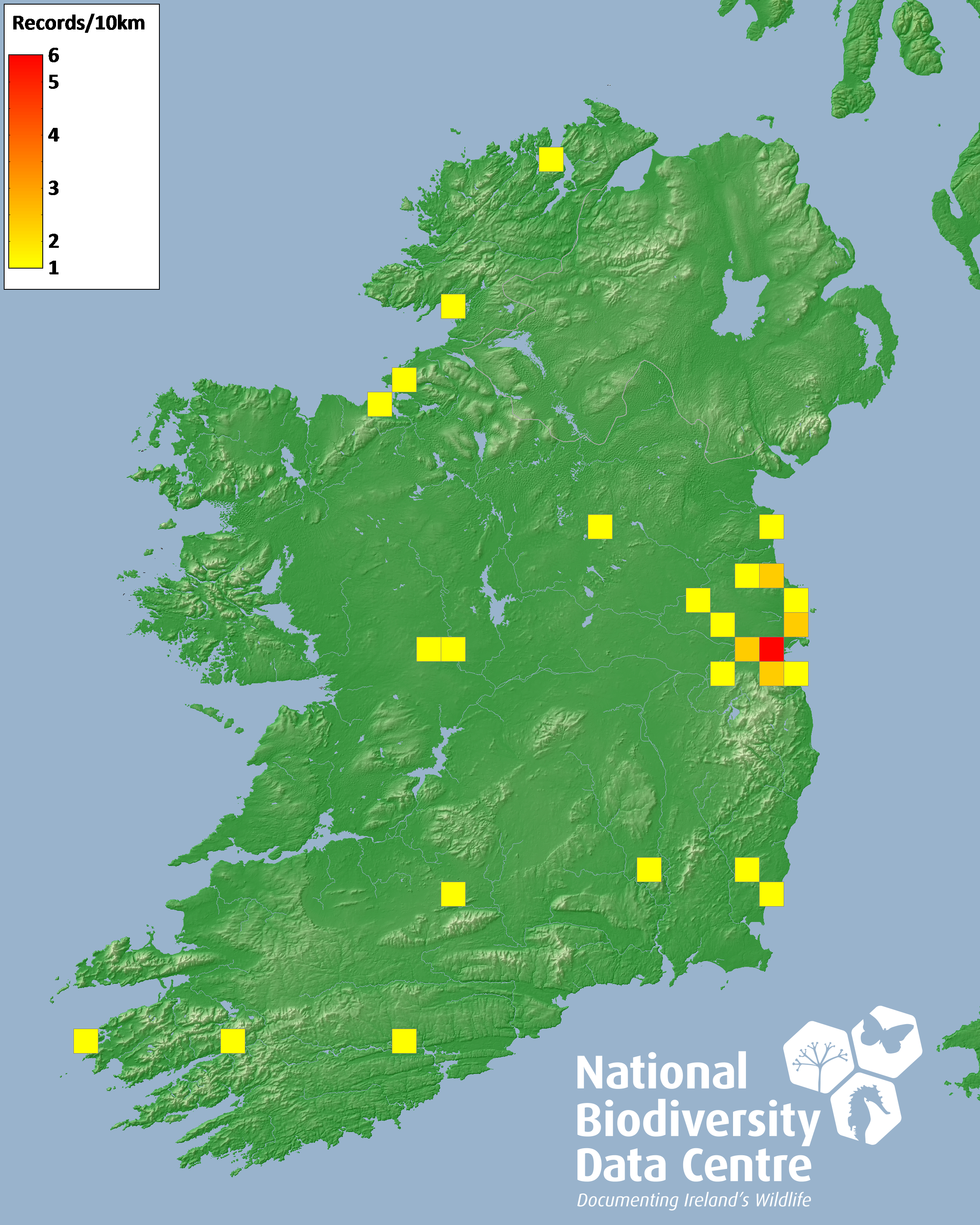 Distribution of the number of records recorded within each 10km grid square (ITM).Marine Map - 50km