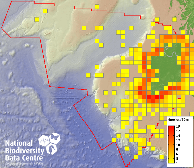 Distribution of the number of species recorded within each 10km grid square (ITM).Marine Map - 50Km