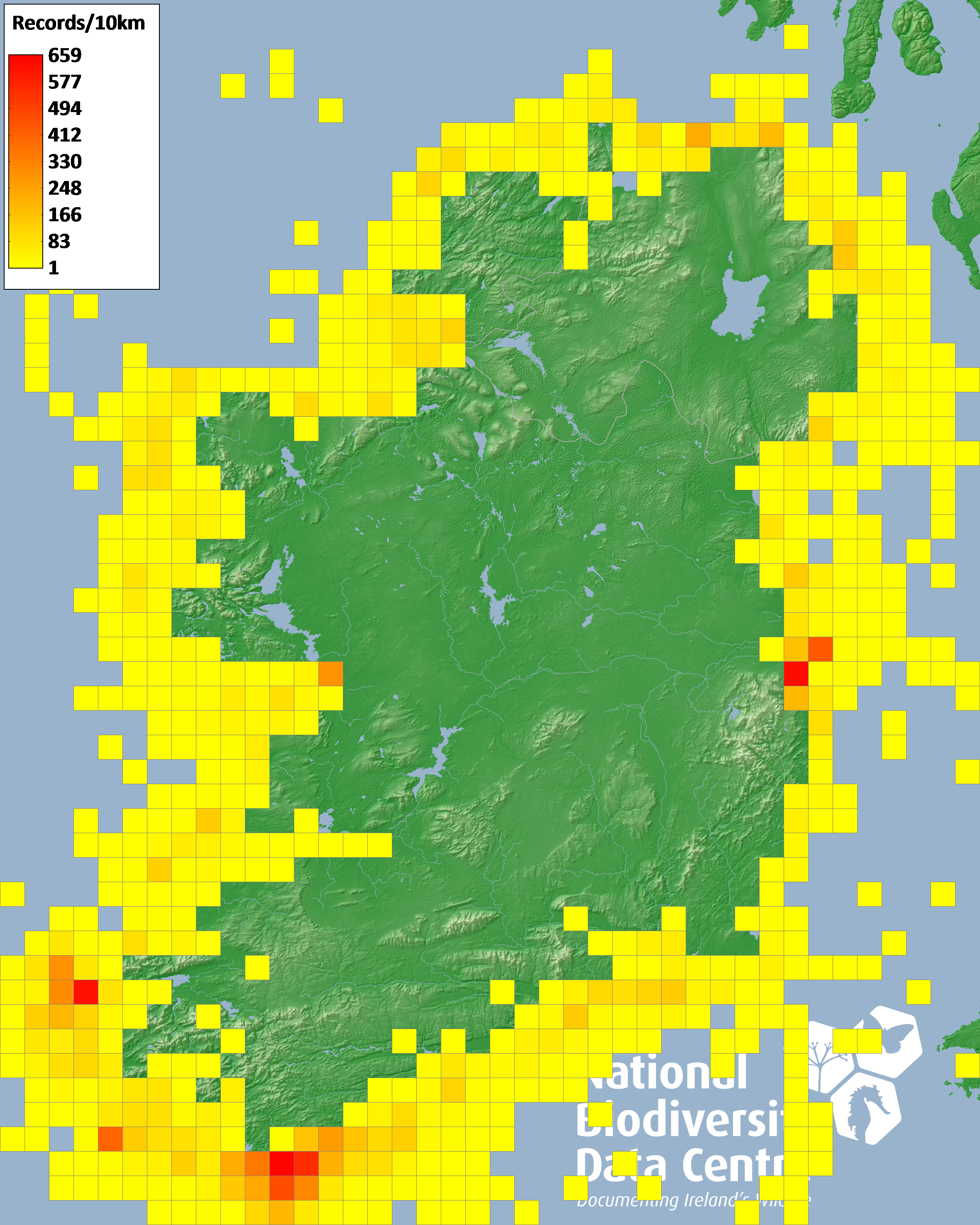 Distribution of the number of records within each 10km grid square (ITM).Marine Map - 50Km