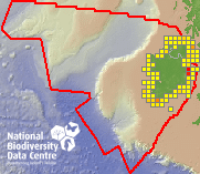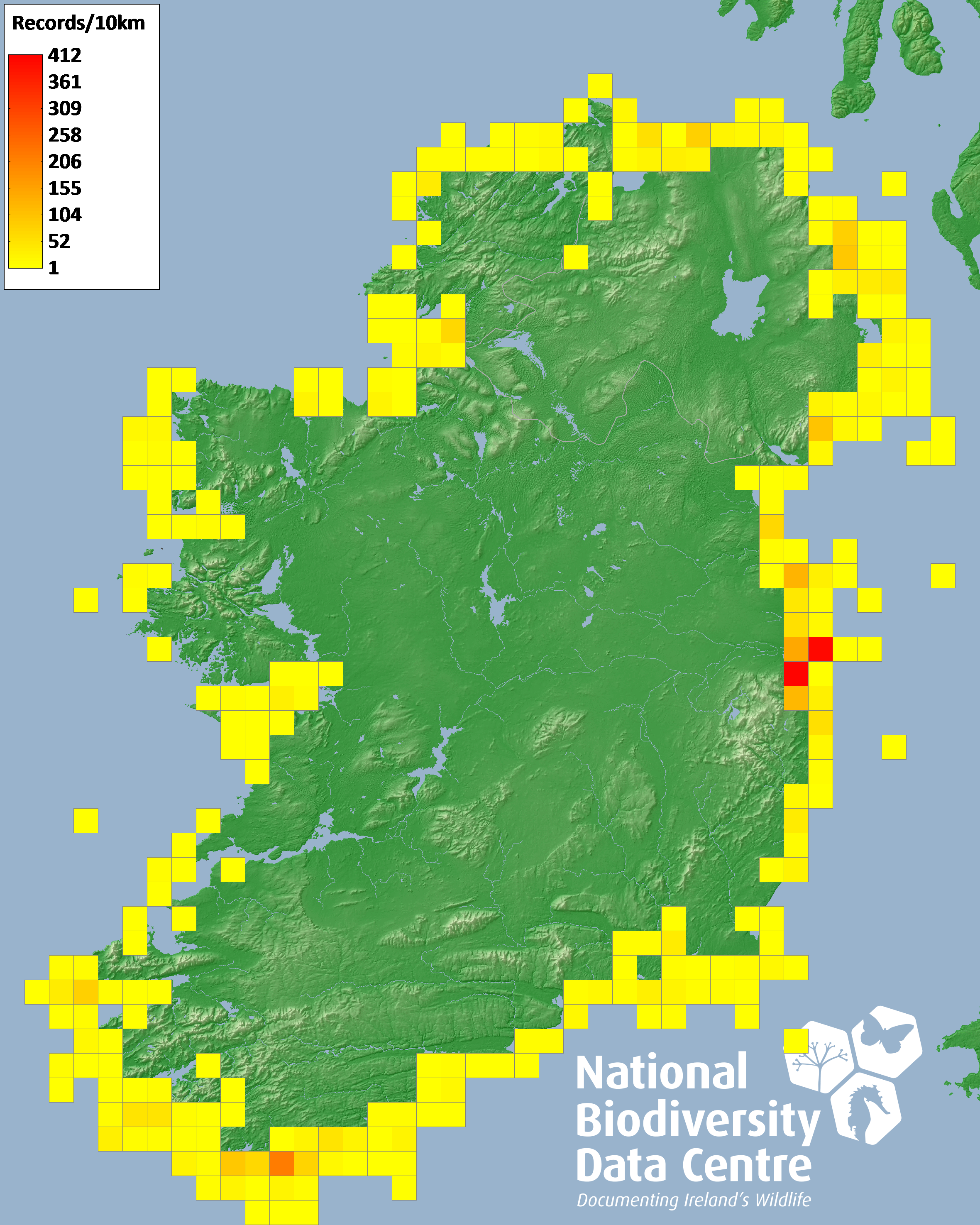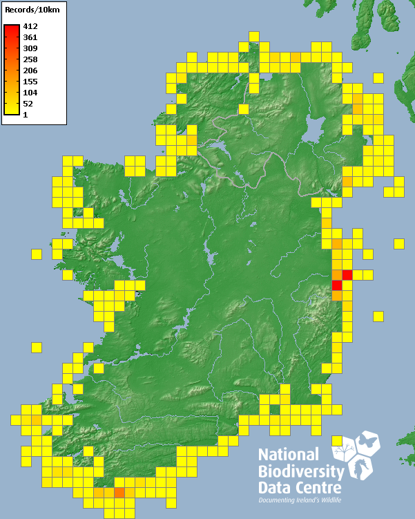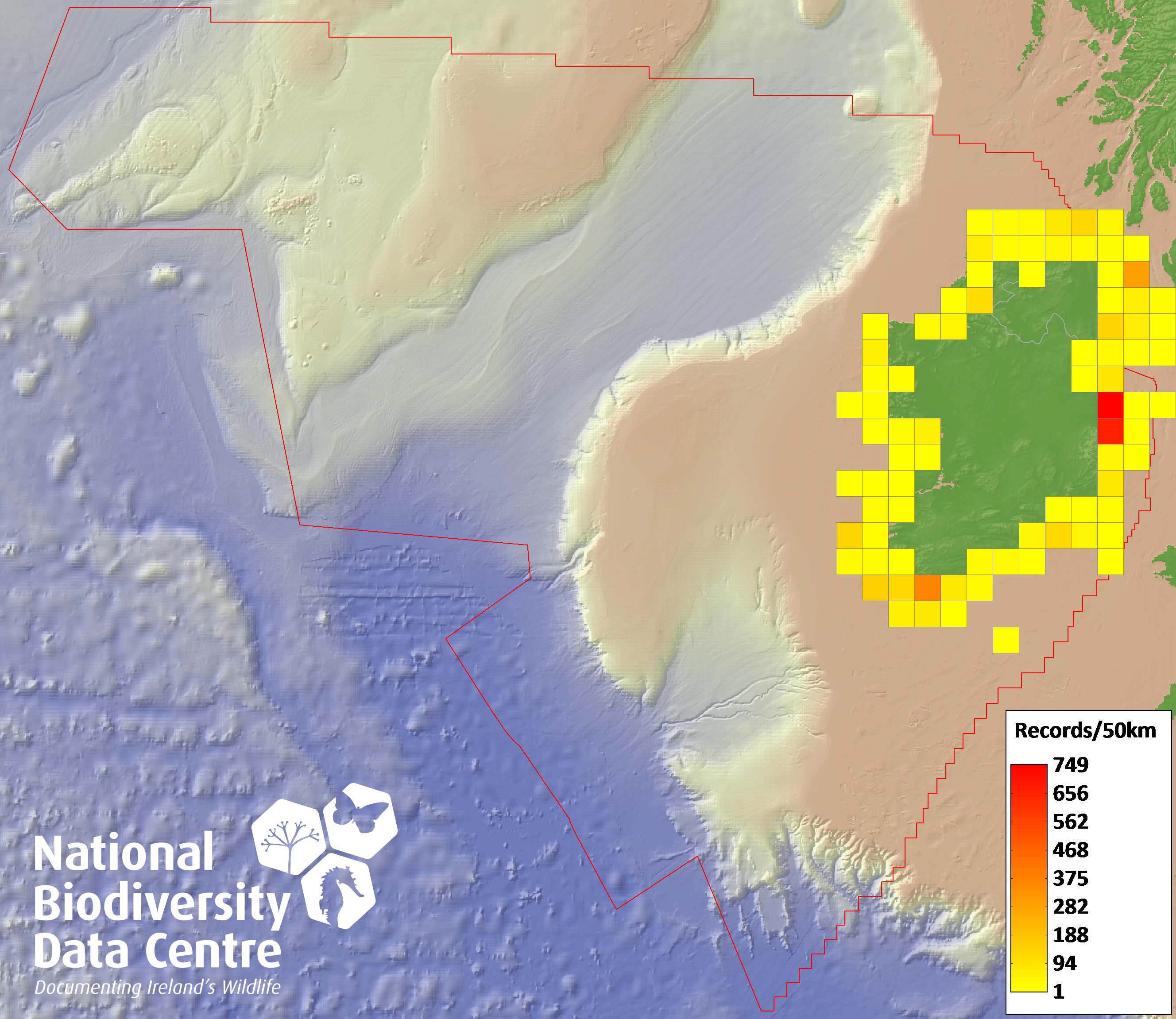 Distribution of the number of records recorded within each 10km grid square (ITM).Marine Map - 50km