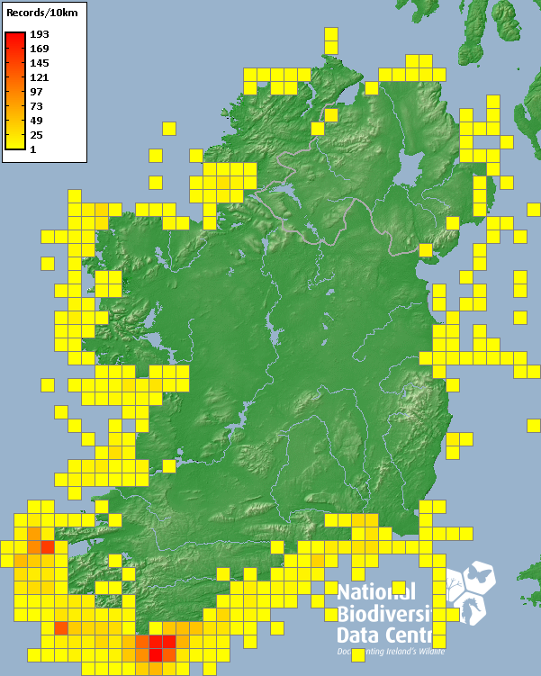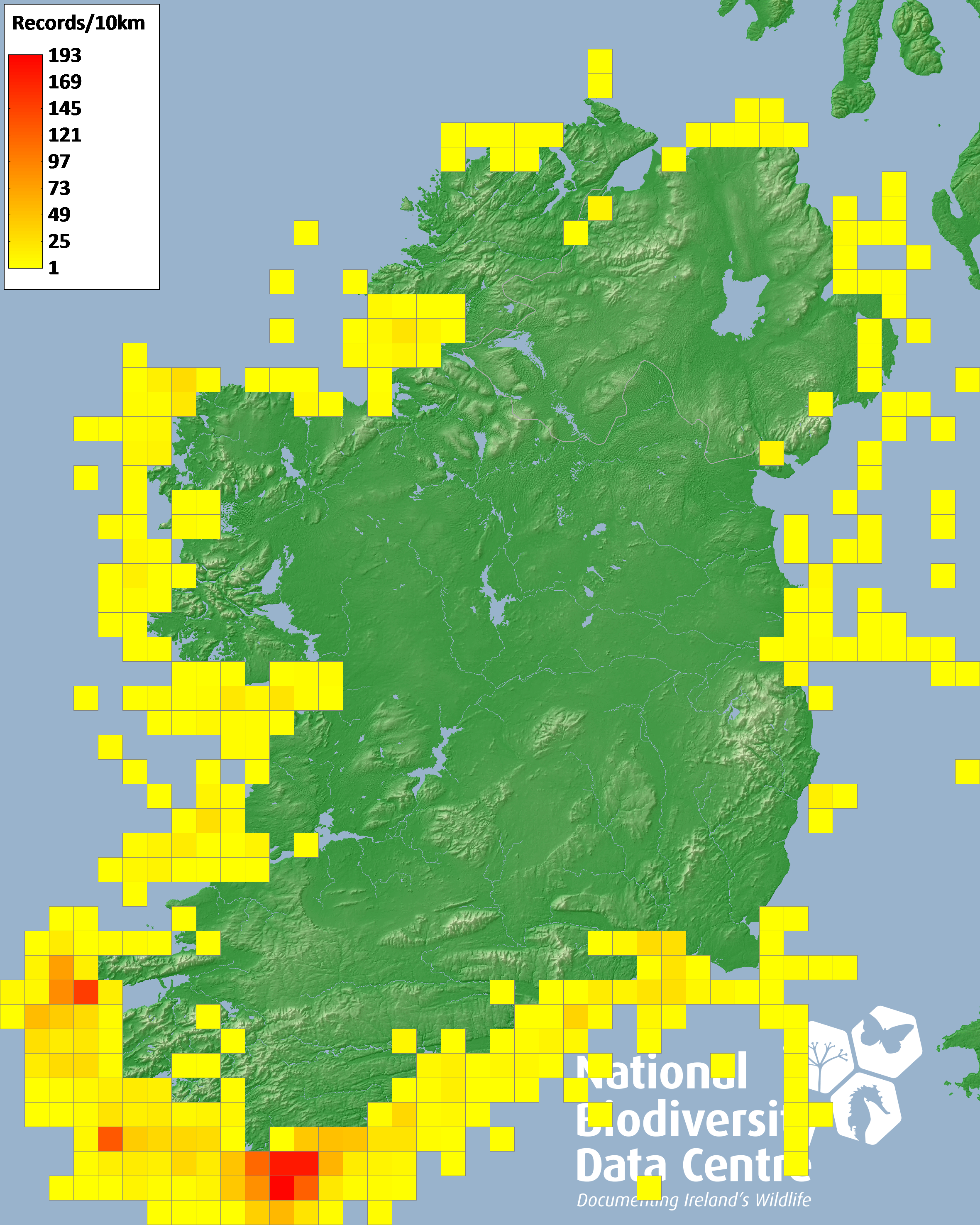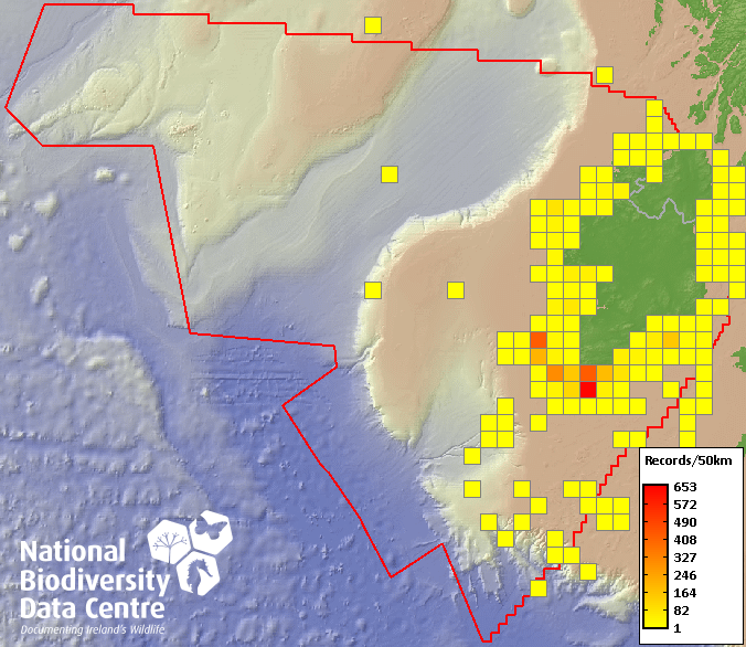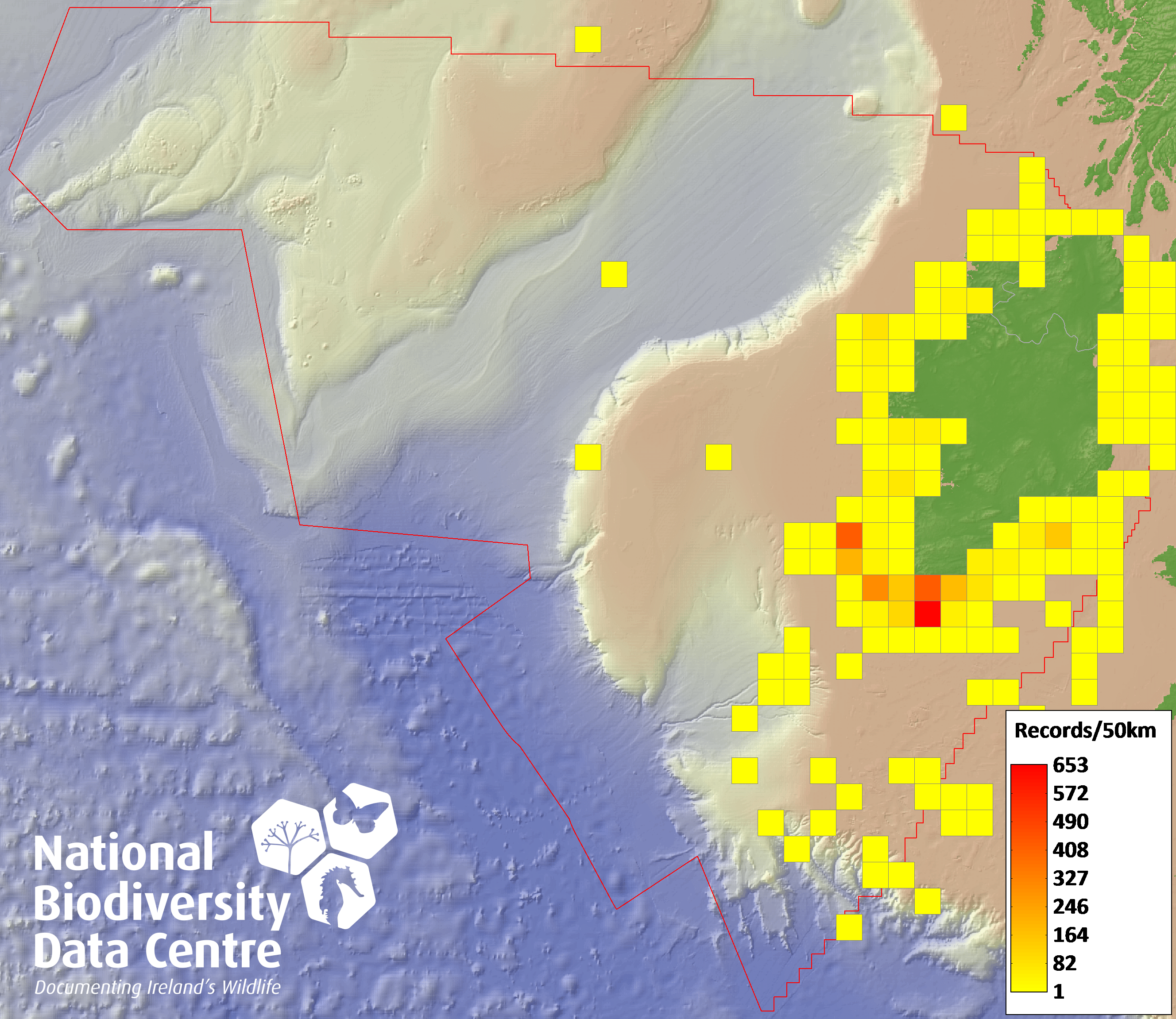 Distribution of the number of records recorded within each 10km grid square (ITM).Marine Map - 50km
